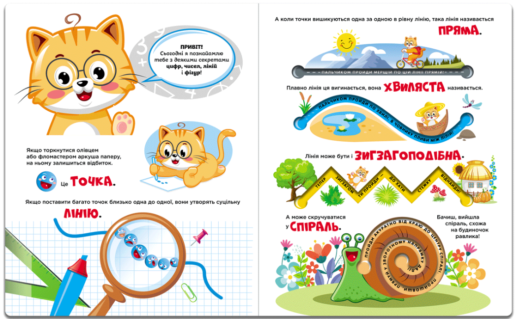 знайомить із базовими математичними поняттями, як-от: точка, лінія, відрізок, кут, форма, розмір, напрямок, відстань, фігура, цифра;