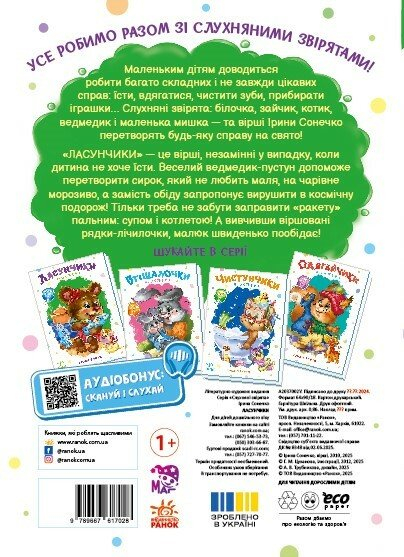 Книга-картонка. Слухняні звірята: Ласунчики. Ірина Сонечко. Аудіобонус. Ранок