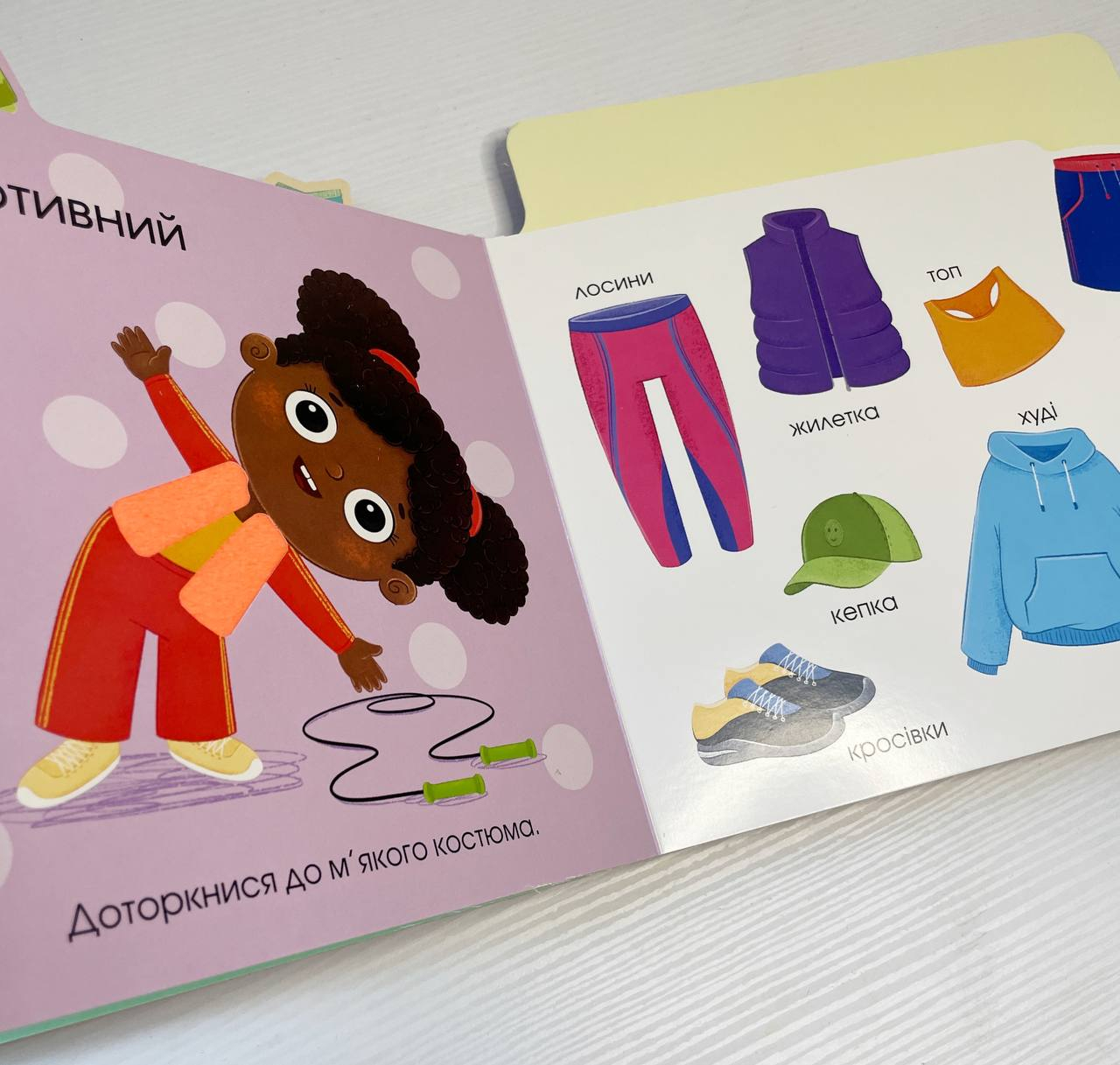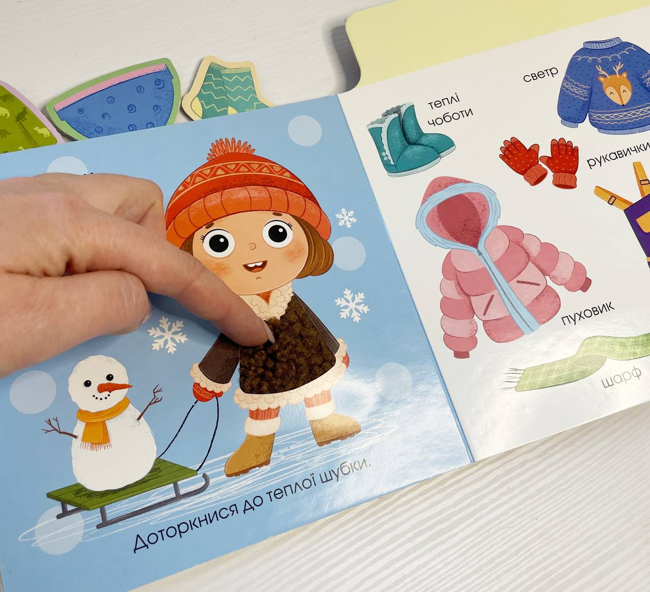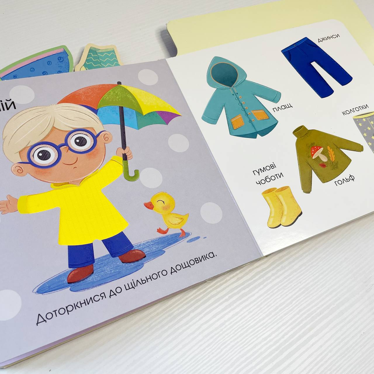 Ця унікальна тактильна книжка допоможе малюку дізнатися про одяг, який ми носимо в різні пори року та вдягаємо для різних занять. Спеціальні вставки дозволять відчути текстуру футболки, піжами, спортивного костюма, дощовика, шуби та допоможуть малюку розвинути моторні навички та сенсорні відчуття.