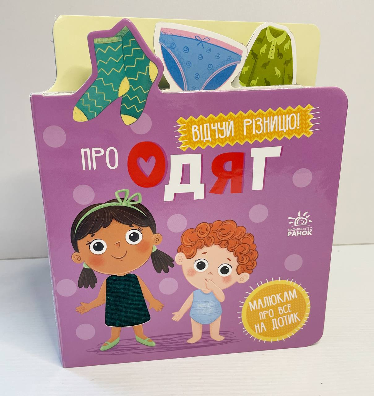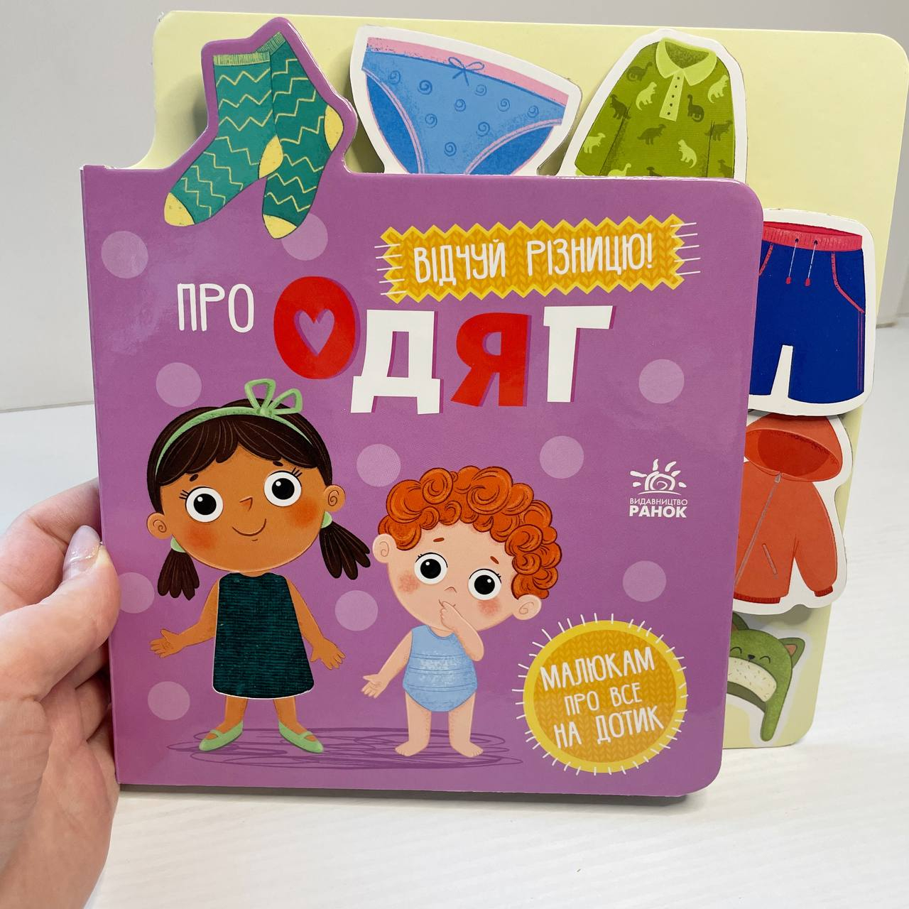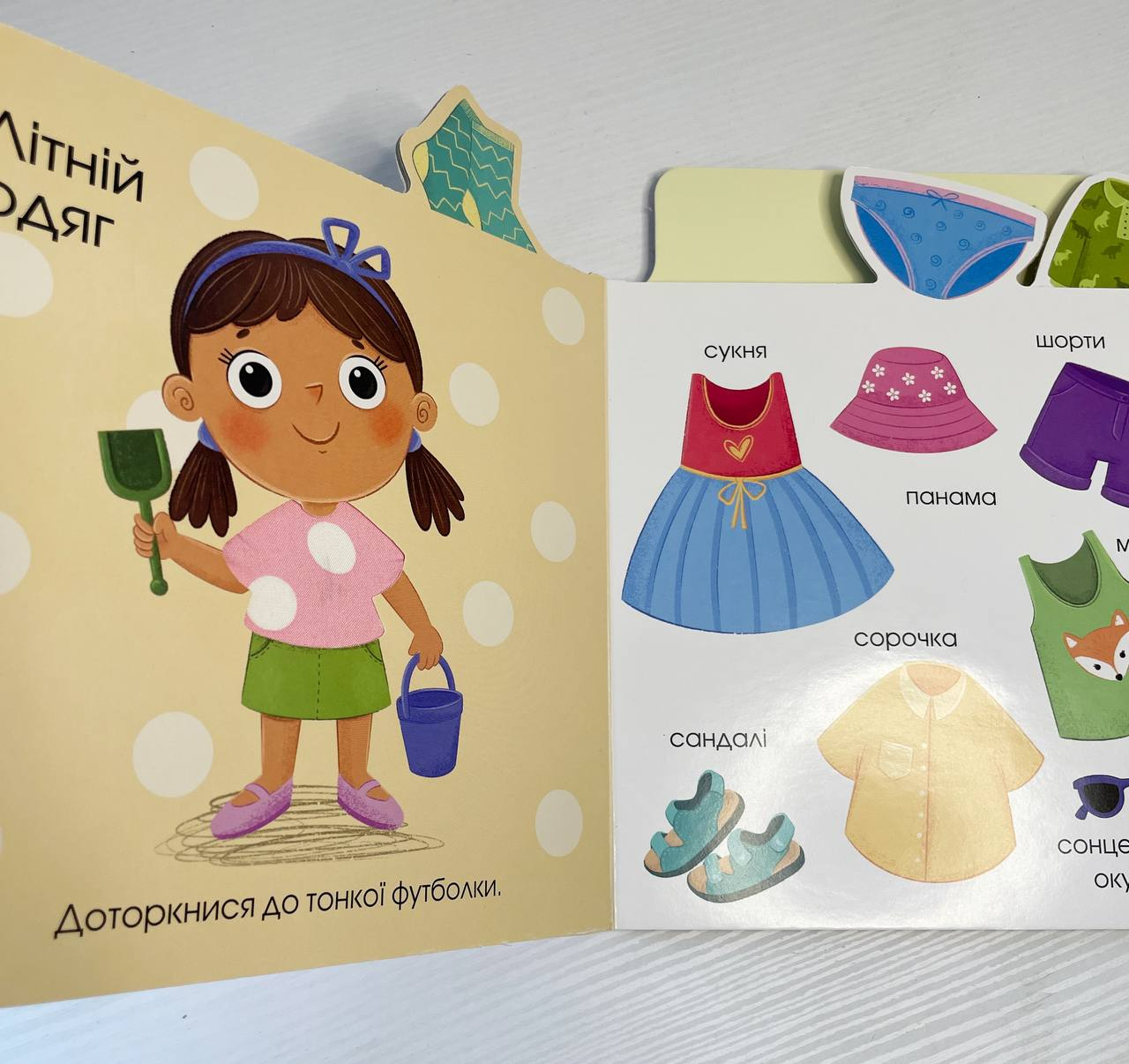 Ця унікальна тактильна книжка допоможе малюку дізнатися про одяг, який ми носимо в різні пори року та вдягаємо для різних занять. Спеціальні вставки дозволять відчути текстуру футболки, піжами, спортивного костюма, дощовика, шуби та допоможуть малюку розвинути моторні навички та сенсорні відчуття.