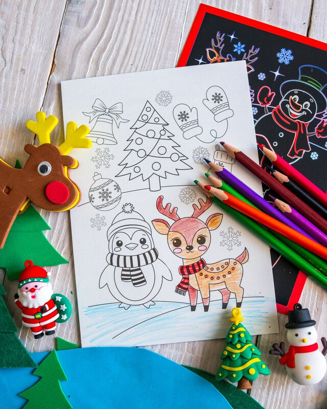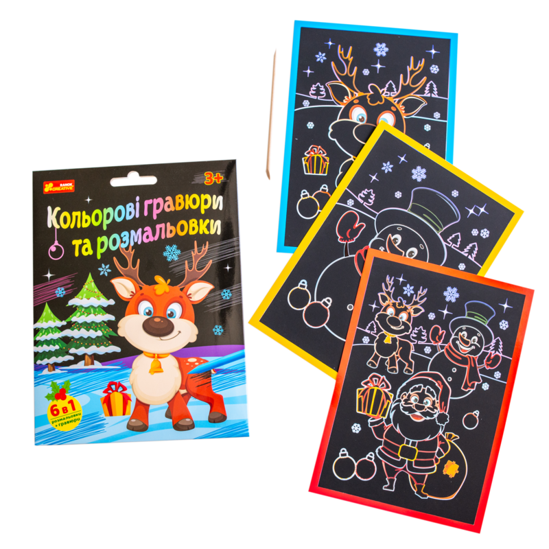 У комплекті 6 в 1: 3 яскраві кольорові гравюри та 3 чорно-білі розмальовки з казковими новорічними героями – оленятком, Святим Миколаєм, сніговичком, пінгвінчиком і котиком біля ялинки. До складу набору також входить якісний дерев’яний стилус, за допомогою якого можна вицарапувати картинки.