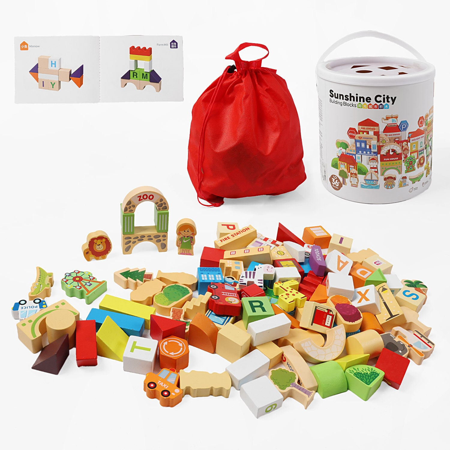 Конструктор дерев’яний Містечко з фігурками тварин, людей, транспорту у відрі
