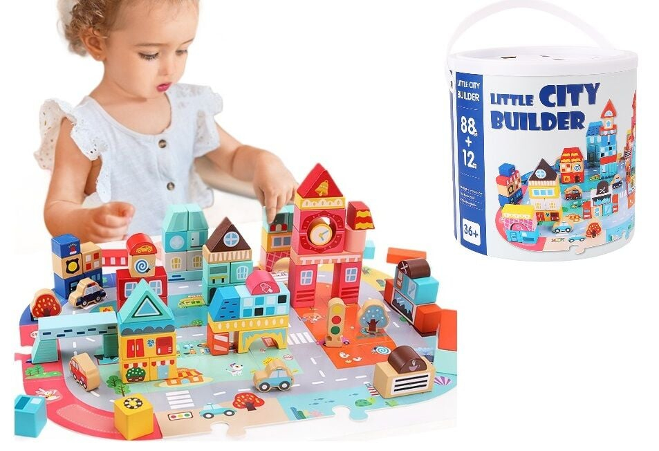 Завдяки цьому набору дитина зможе самостійно створити власне іграшкове містечко. Деталі конструктора виготовлені з натуральної деревини, мають приємну текстуру і відзначаються високою якістю. Набір сприяє розвитку логічного мислення, дрібної моторики, фантазії та навичок сортування.