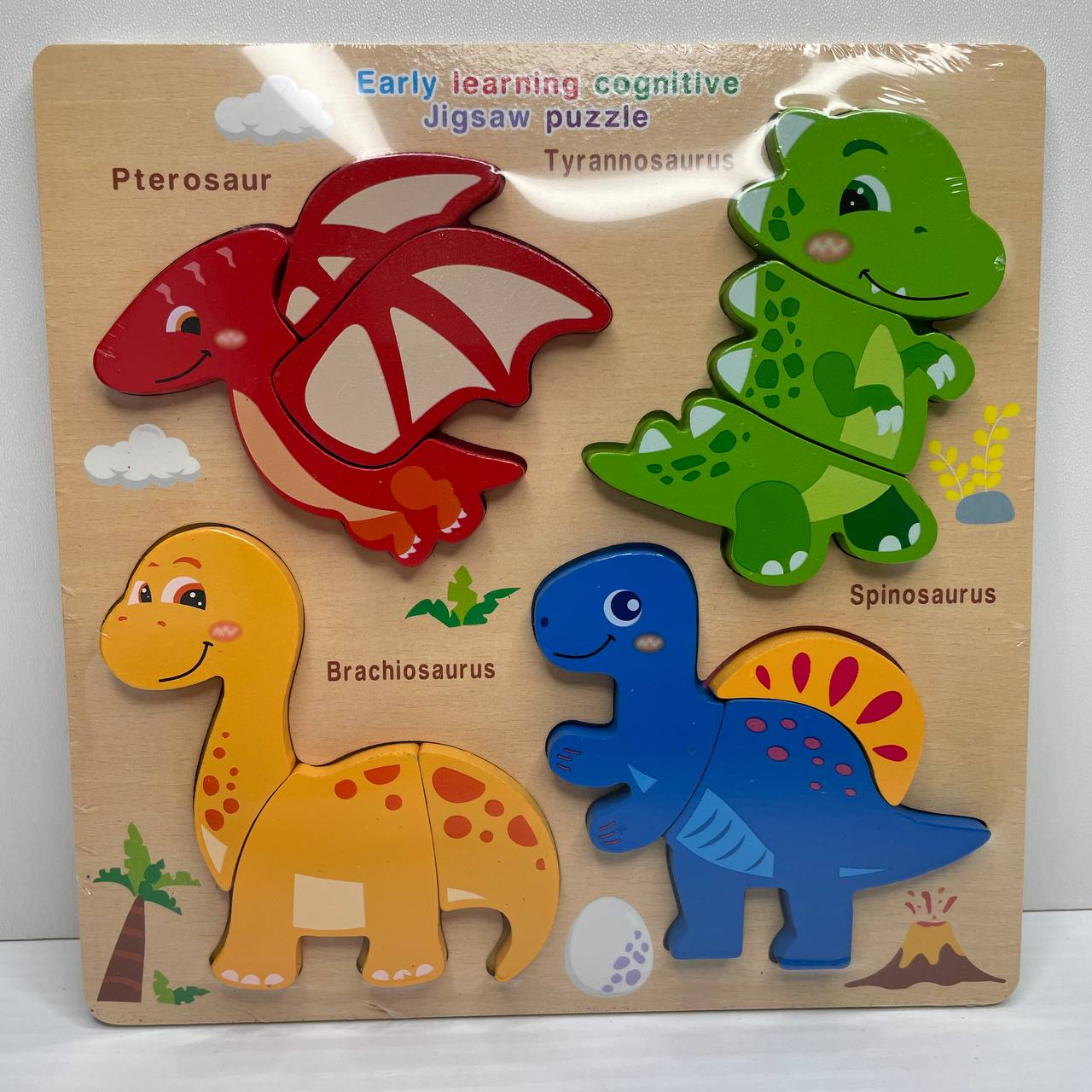 Дерев'яна рамка - вкладиш (пазл) Динозаври з об'ємними фігурами, MD 0771