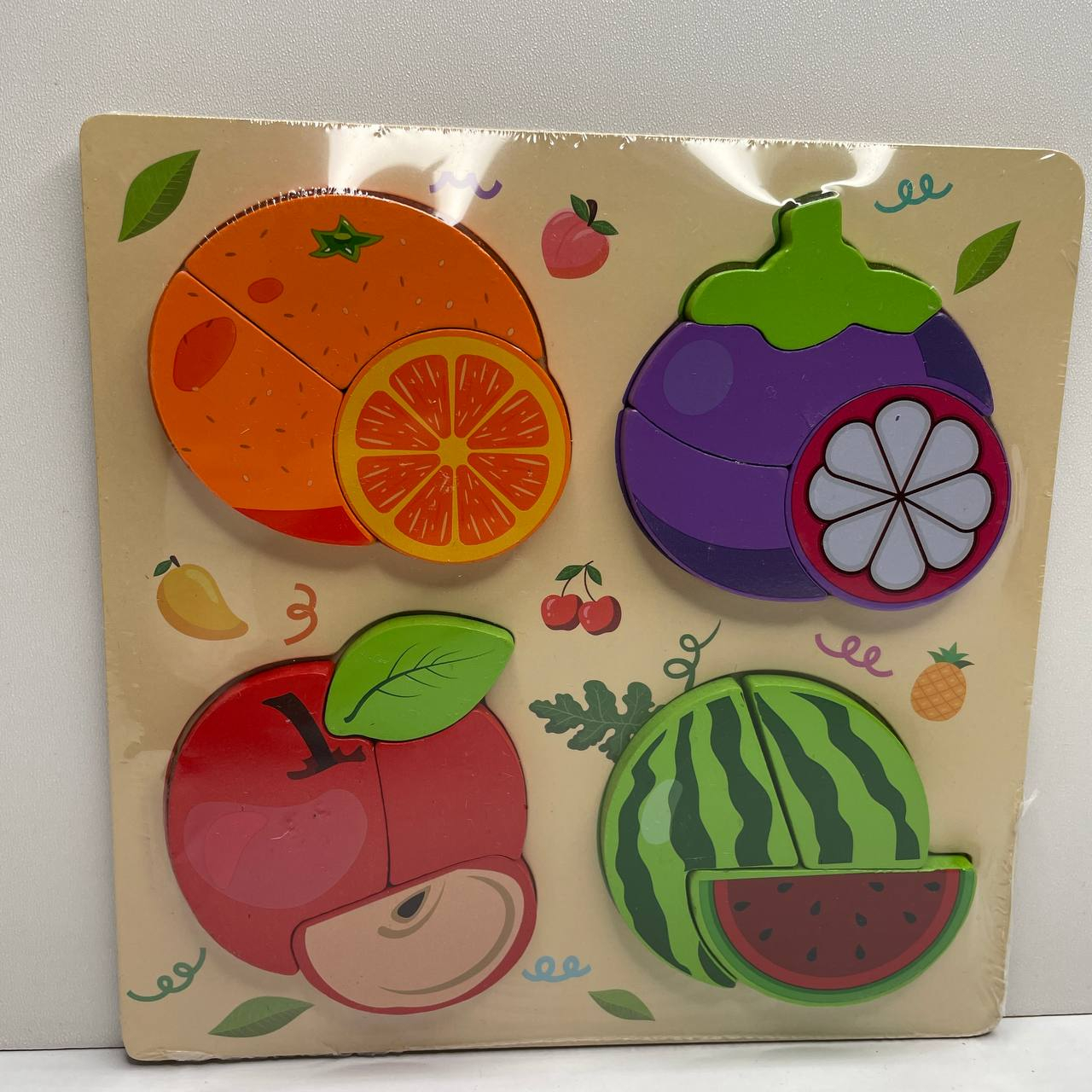 Дерев'яна рамка - вкладка (пазл) Фрукти із обємними фігурами