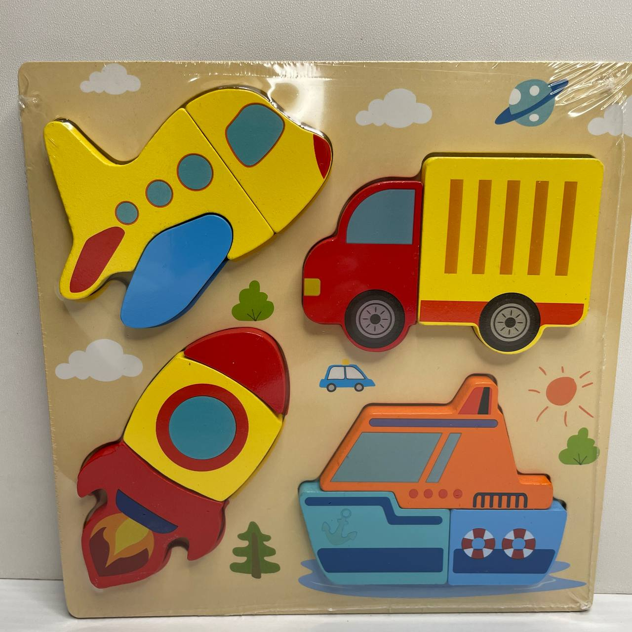 Дерев'яна рамка - вкладка (пазл) Транспорт із обємними фігурами