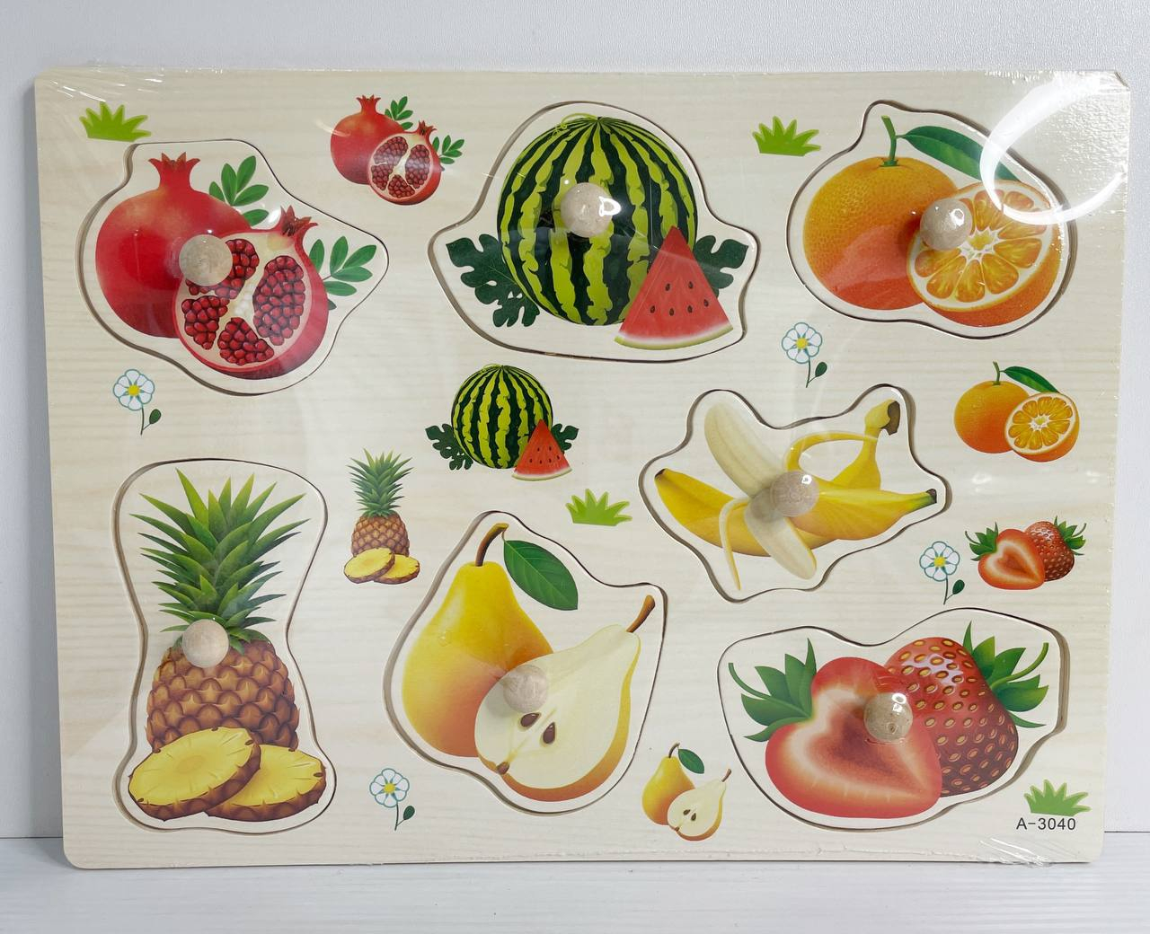 Дерев'яна рамка - вкладиш з ручками та дублюючим малюнком Фрукти та ягоди (реалістична картинка)