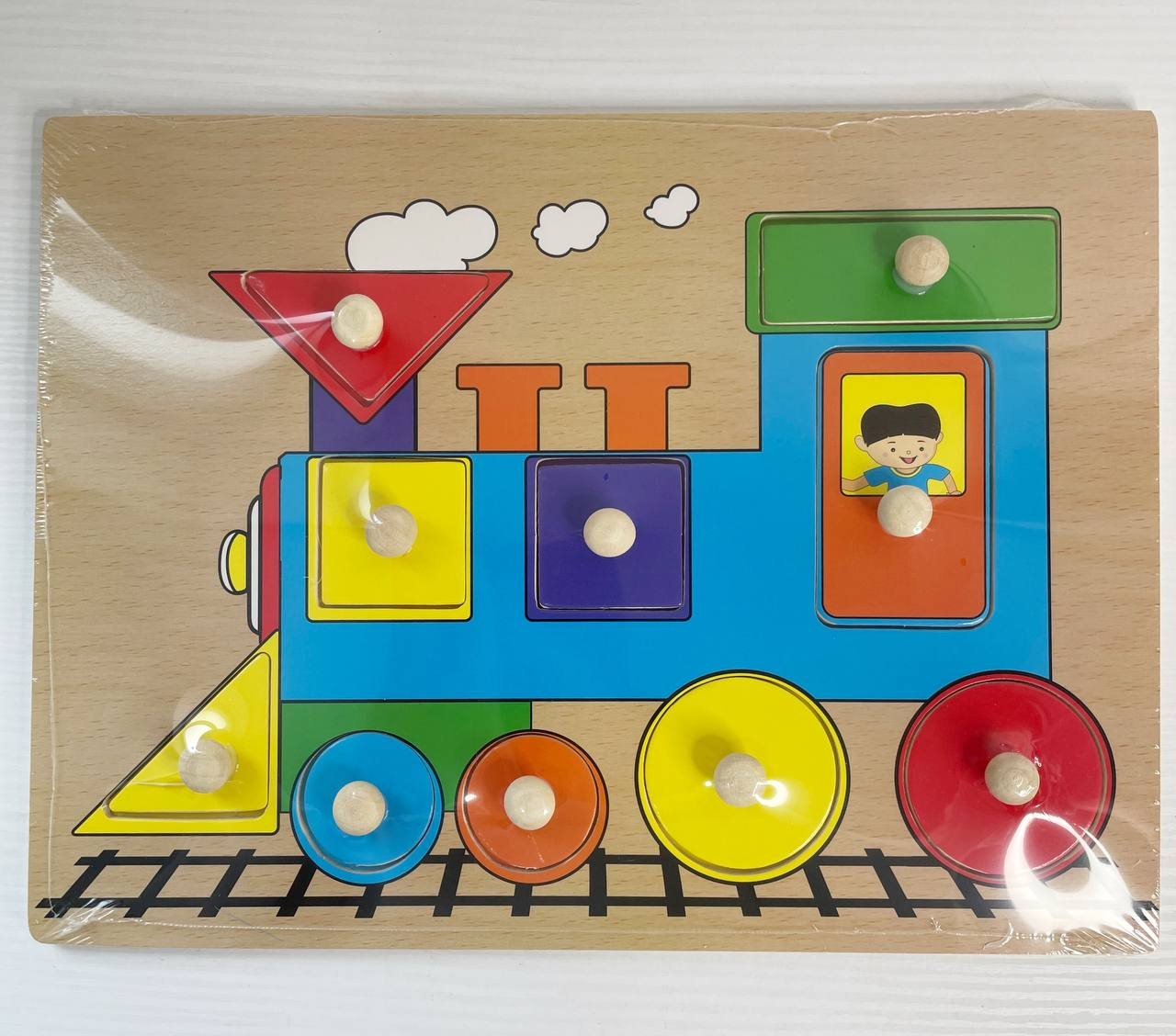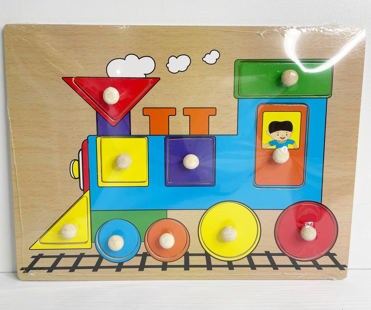 Дерев'яна рамка - вкладиш з ручками та дублюючим малюнком Потяг із геометричними фігурами