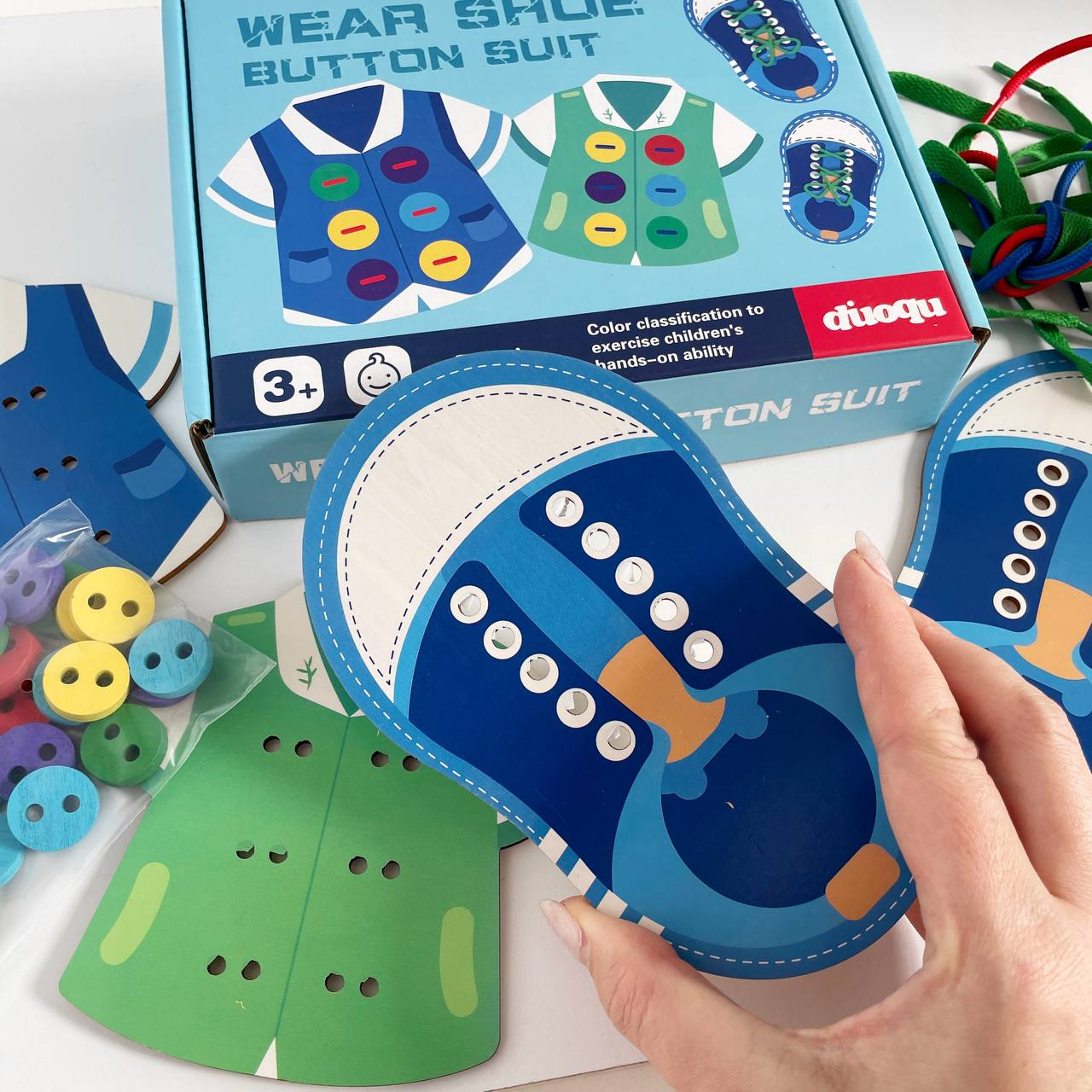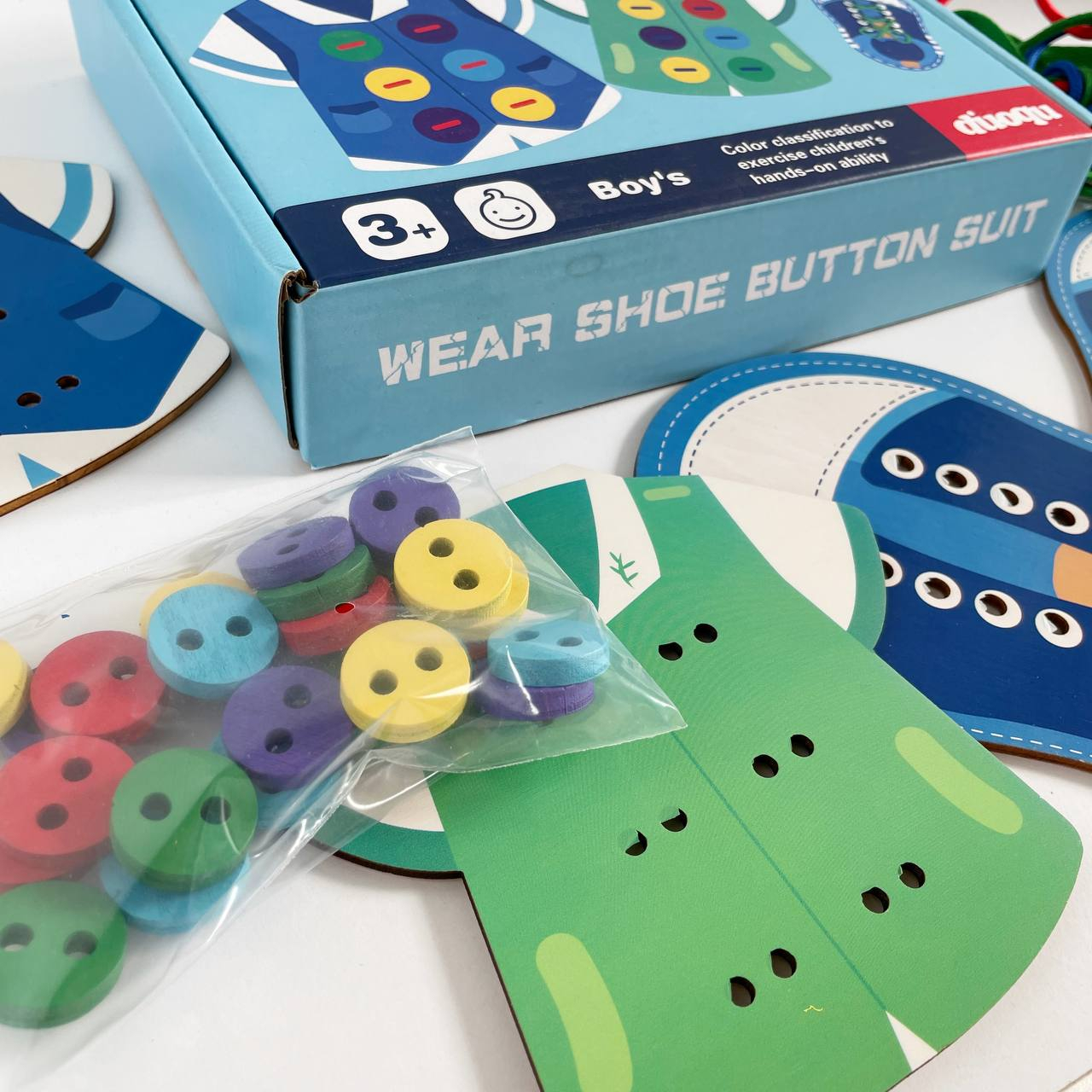 До складу набору входять кумедні дерев’яні кеди, елементи одягу з отворами, ґудзики та яскраві шнурки.