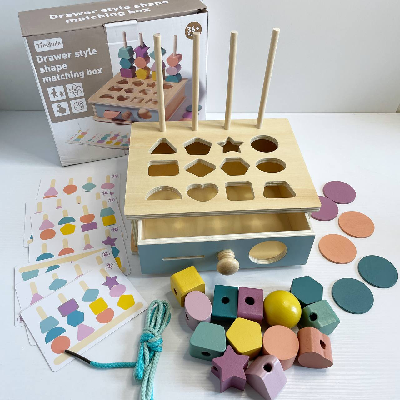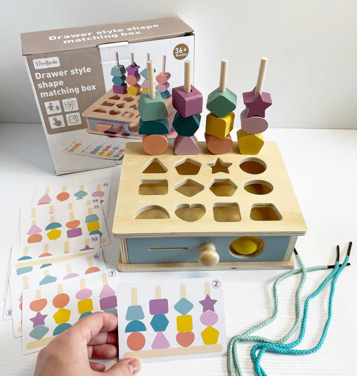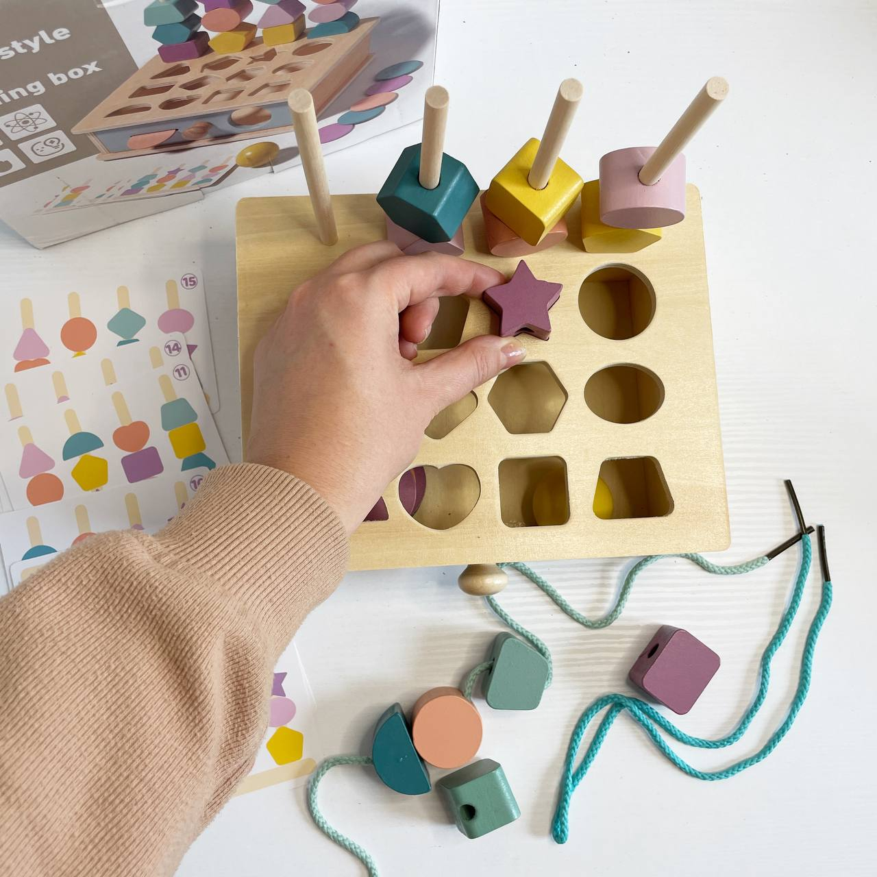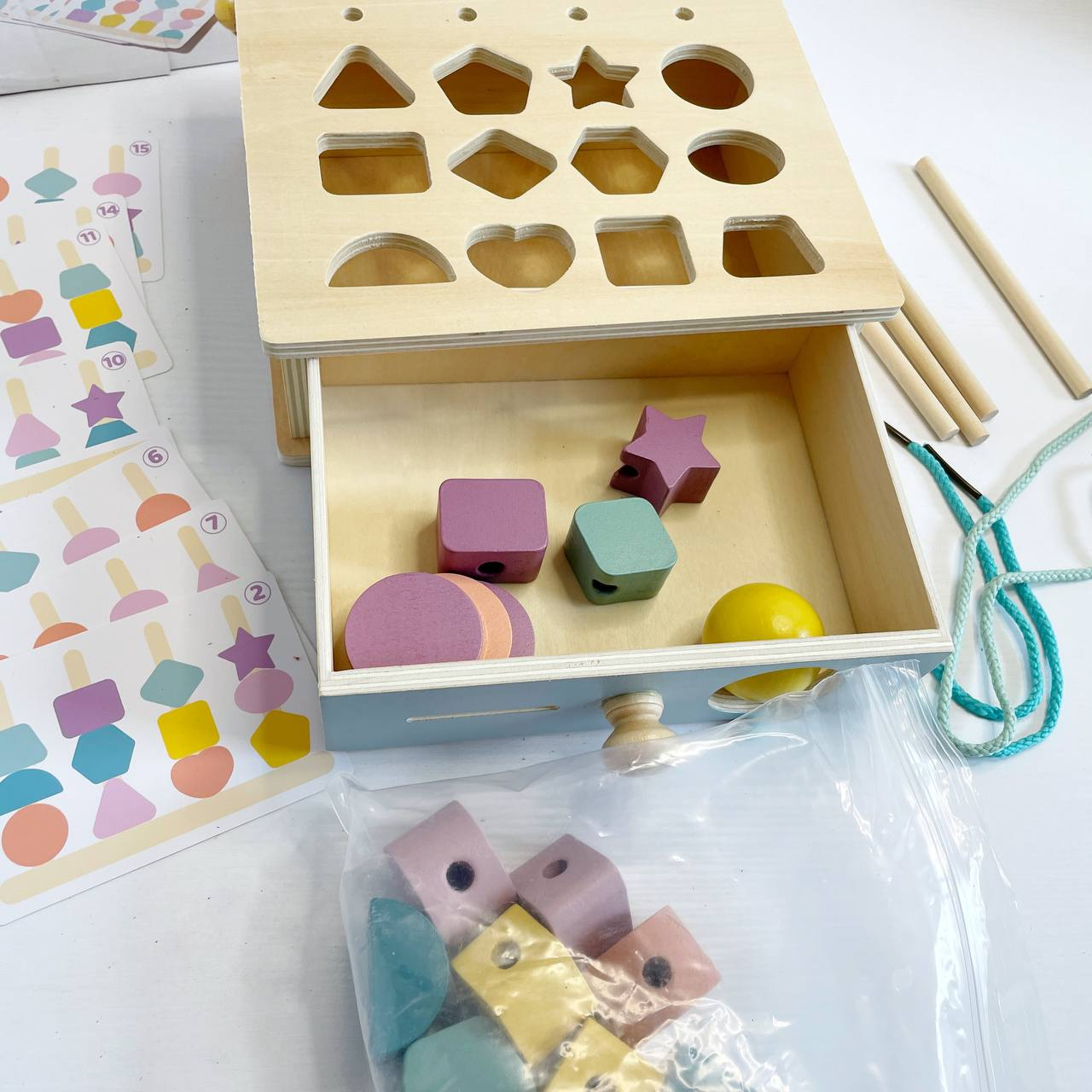 Дерев’яна пірамідка-сортер з геометричними фігурами, картками, шнурівка C9433