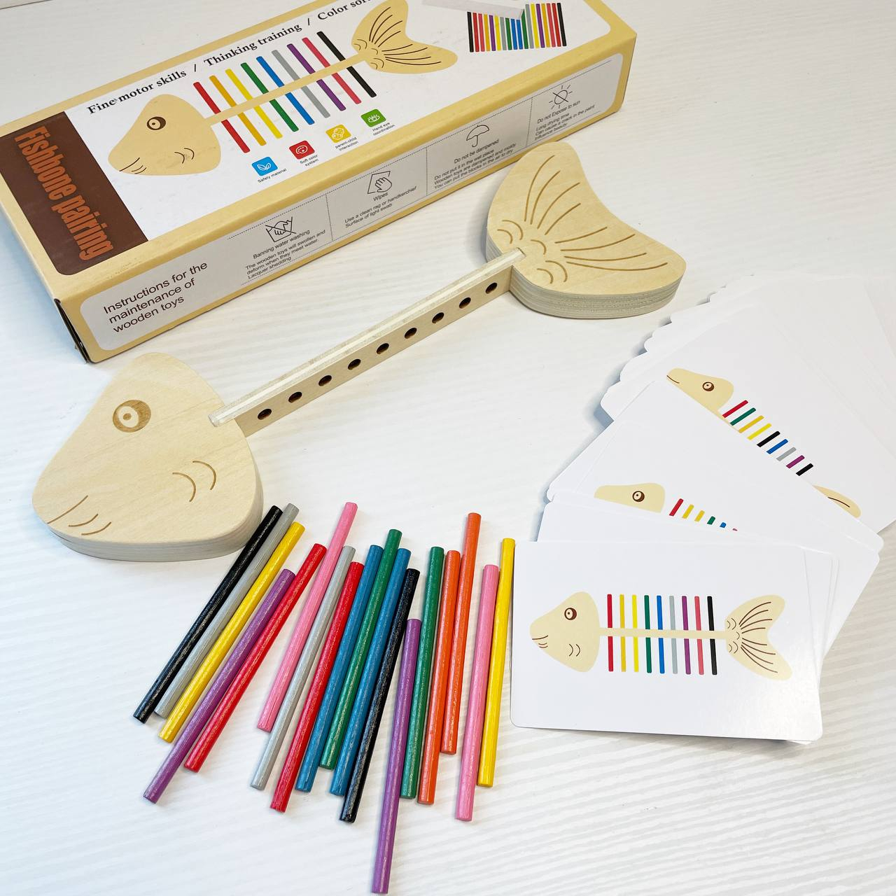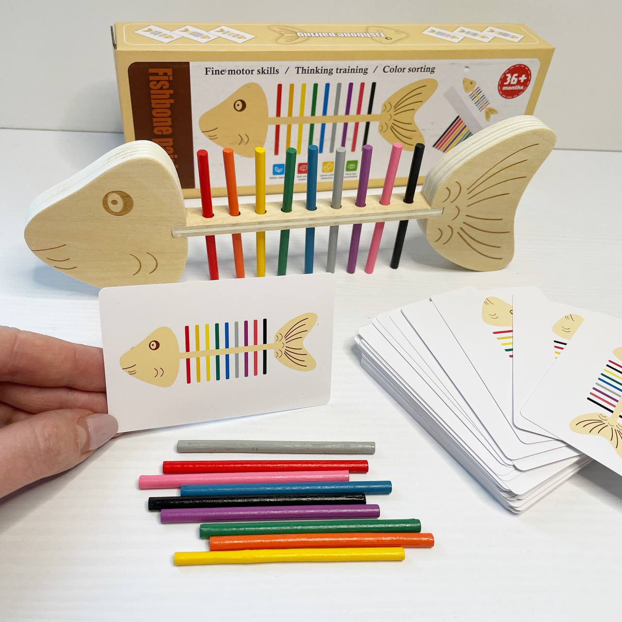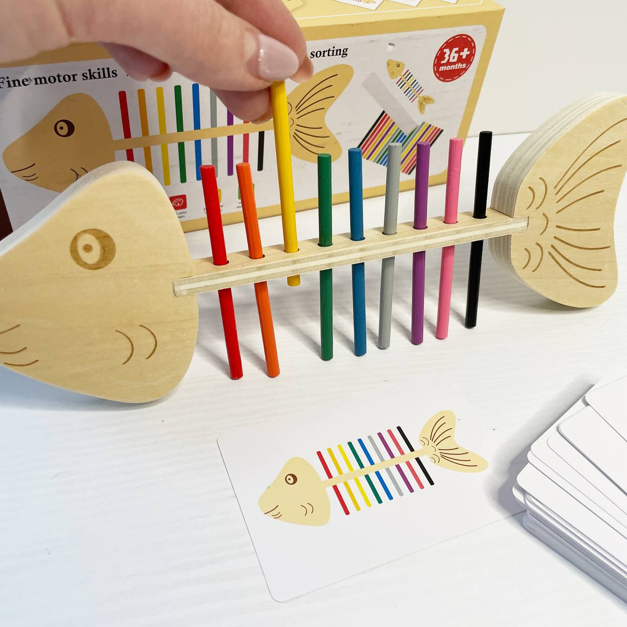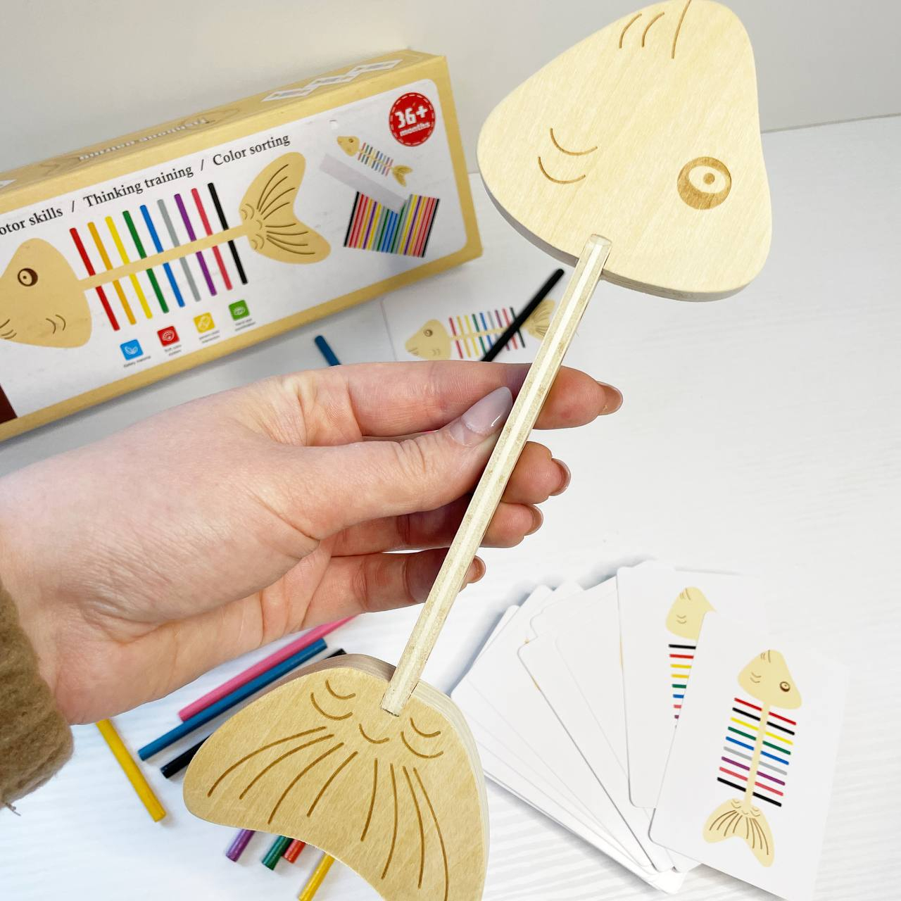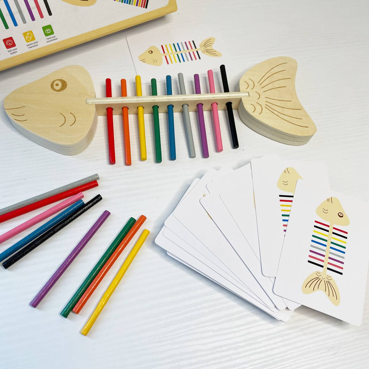Дрібна моторика та точність: Завдання полягає у вкладанні (вбудовуванні) кольорових паличок у відповідні отвори "скелета" риби. Це чудово тренує координацію "рука-око" та спритність пальчиків.