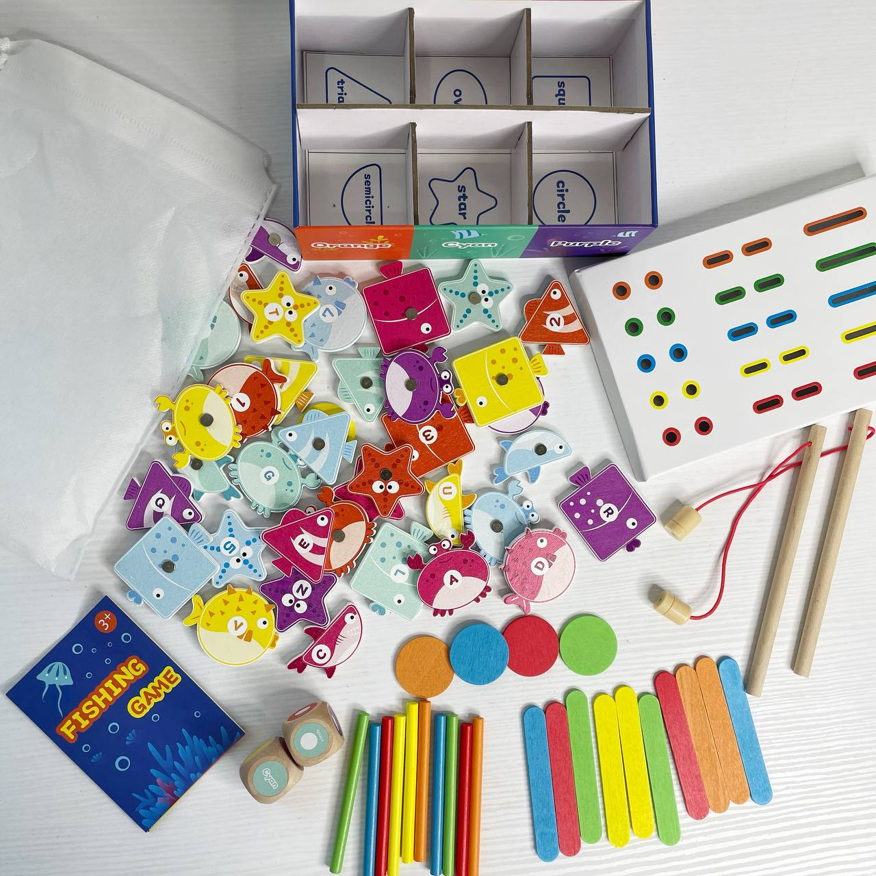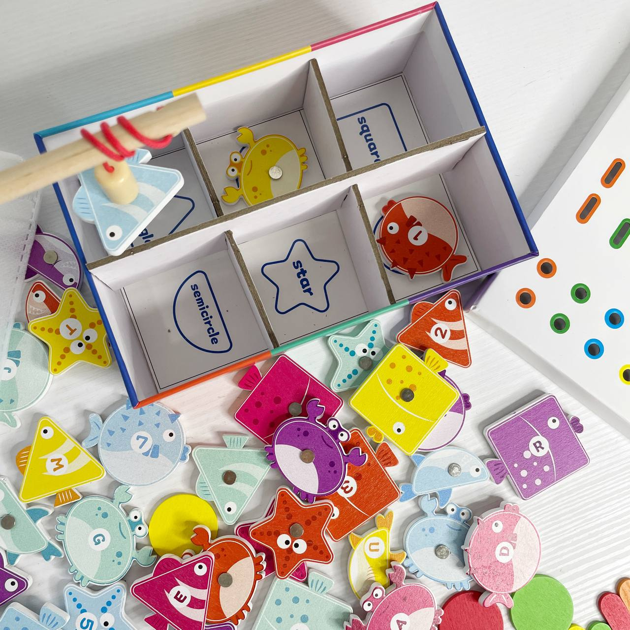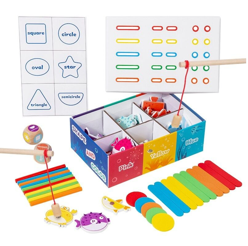 Коробка з відділеннями допоможе розкладати елементи за кольорами чи формами. За допомогою вудочок із магнітами дитина «ловить» рибок і переносить їх у відповідні секції — це тренує координацію та уважність.