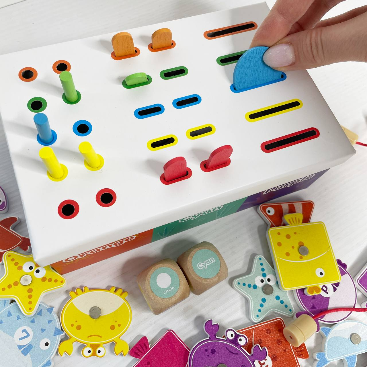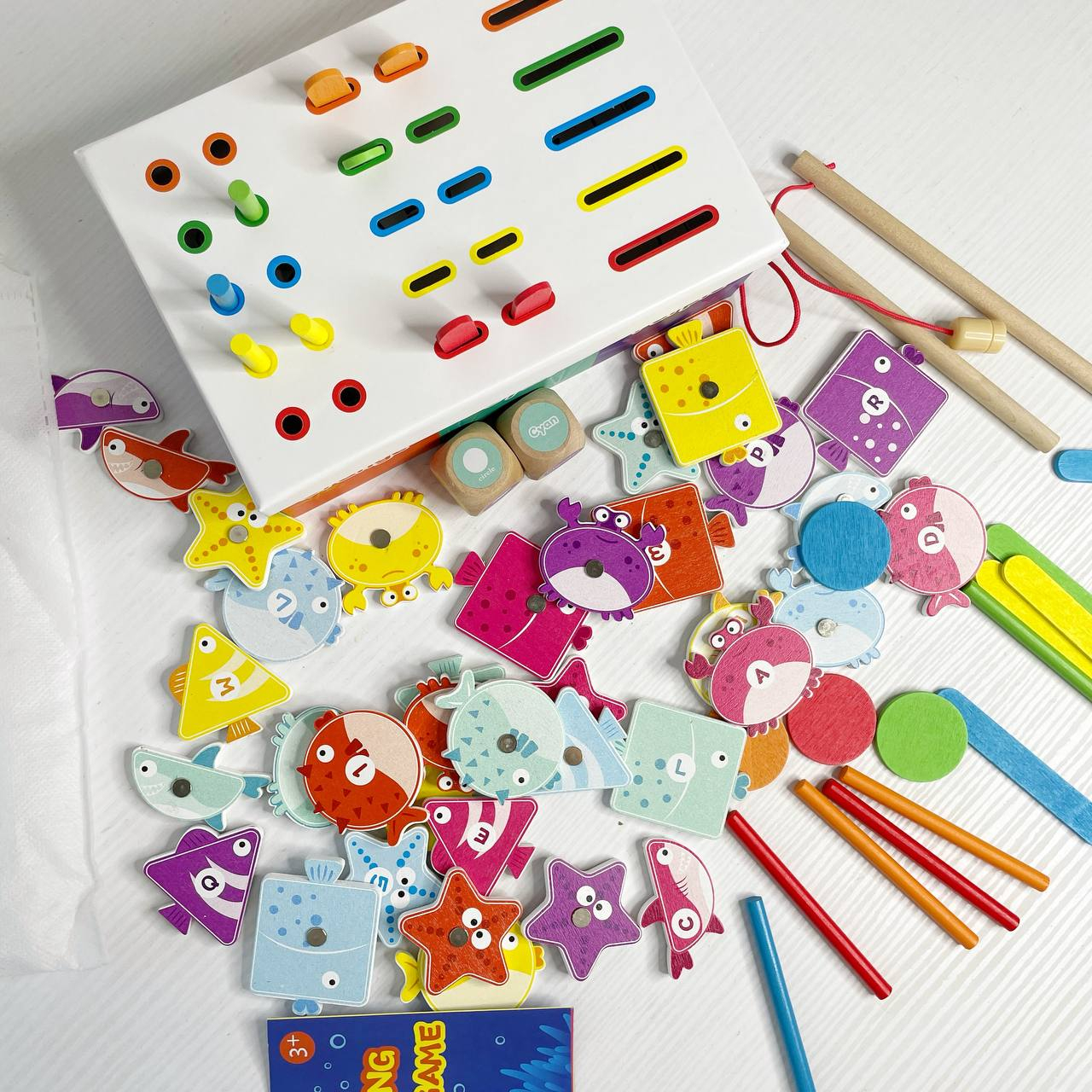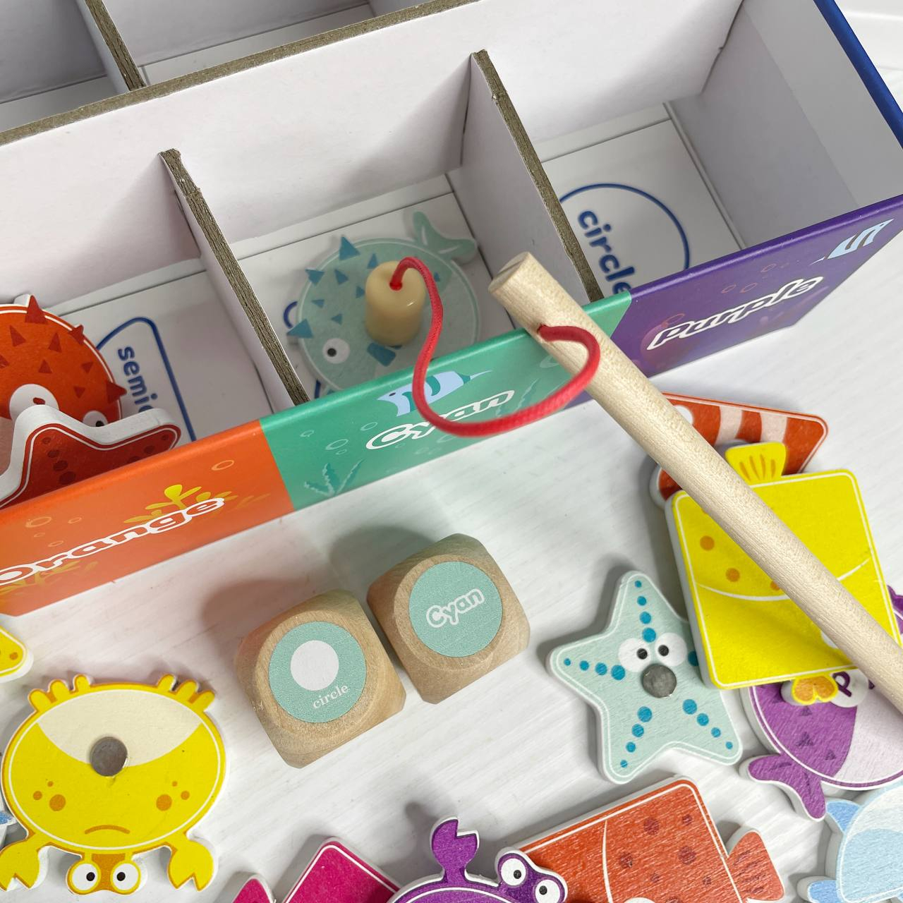 Коробка з відділеннями допоможе розкладати елементи за кольорами чи формами. За допомогою вудочок із магнітами дитина «ловить» рибок і переносить їх у відповідні секції — це тренує координацію та уважність.