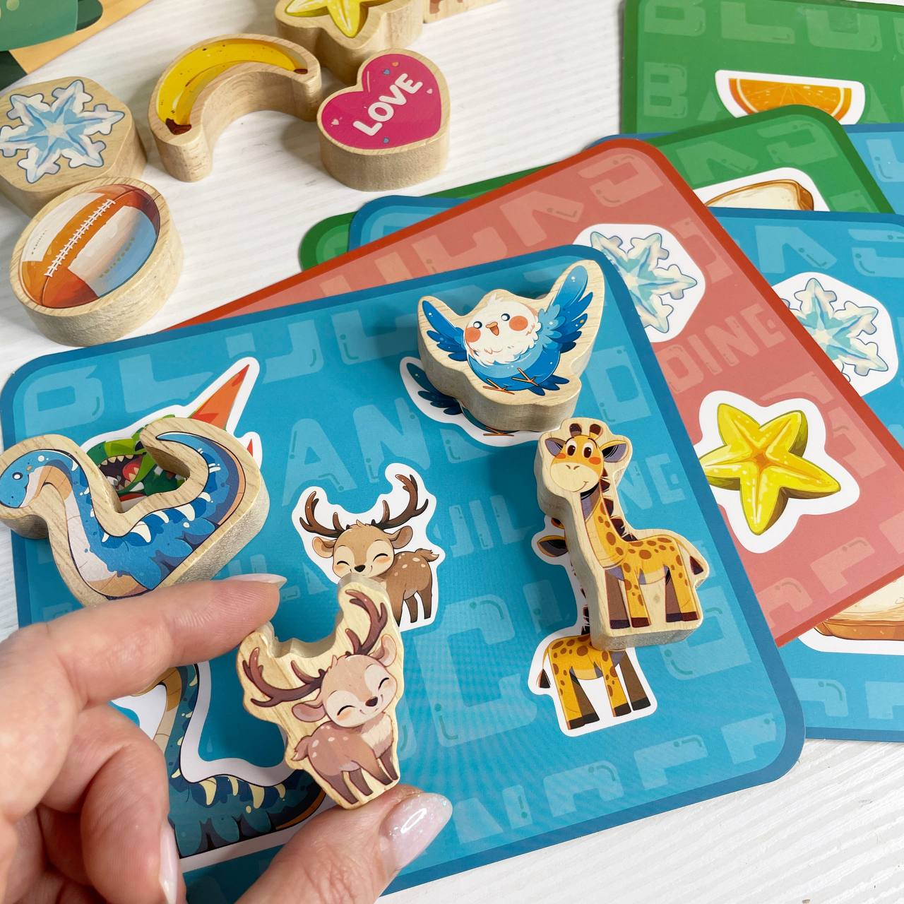 Дітям потрібно обережно розміщувати дерев’яні фігурки на основі у формі тварини, щоб конструкція не похитнулася й не впала.