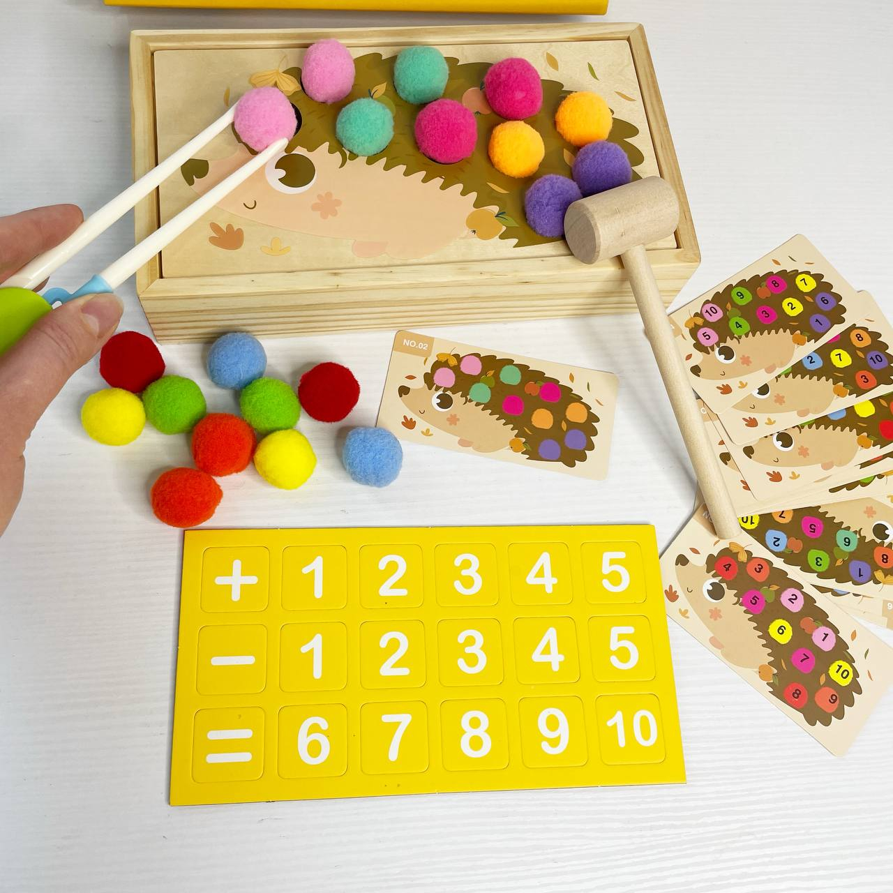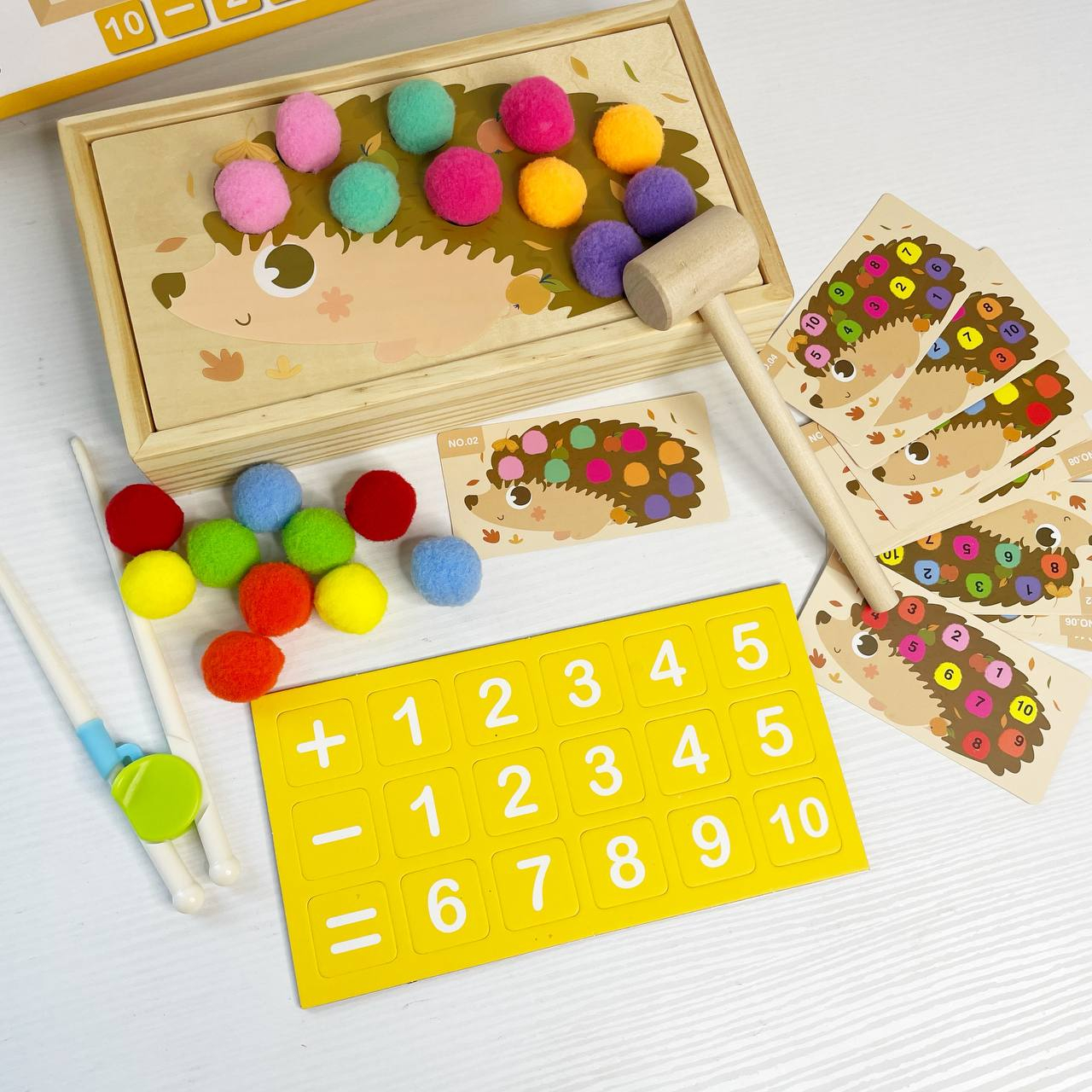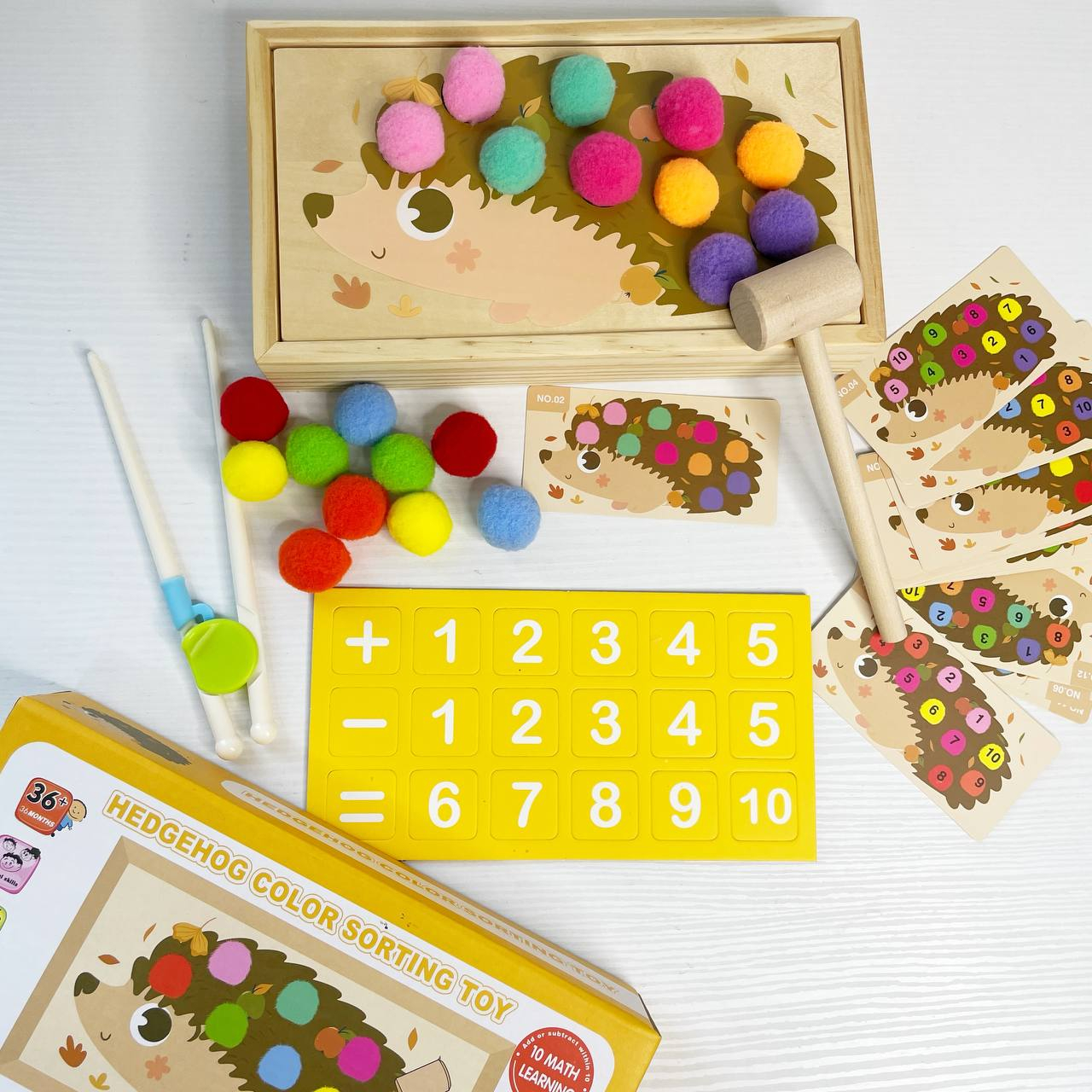 Ця математична гра допомагає дітям засвоювати основи математики в цікавій ігровій формі. Крім цього, малюк зможе викладати кульки відповідно до прикладів або зразків на картках, тренуючи логіку, пам’ять і координацію. Завдяки яскравим кольорам і приємним матеріалам гра перетворює навчання на захопливий процес!