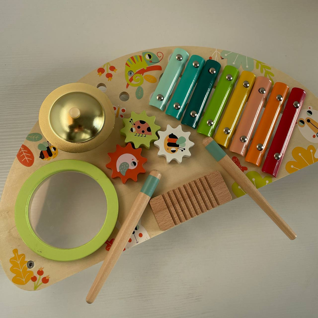 У комплекті 2 палички для гри на ксилофоні, рухомі деталі, шестерні та елементи для сенсорного розвитку.