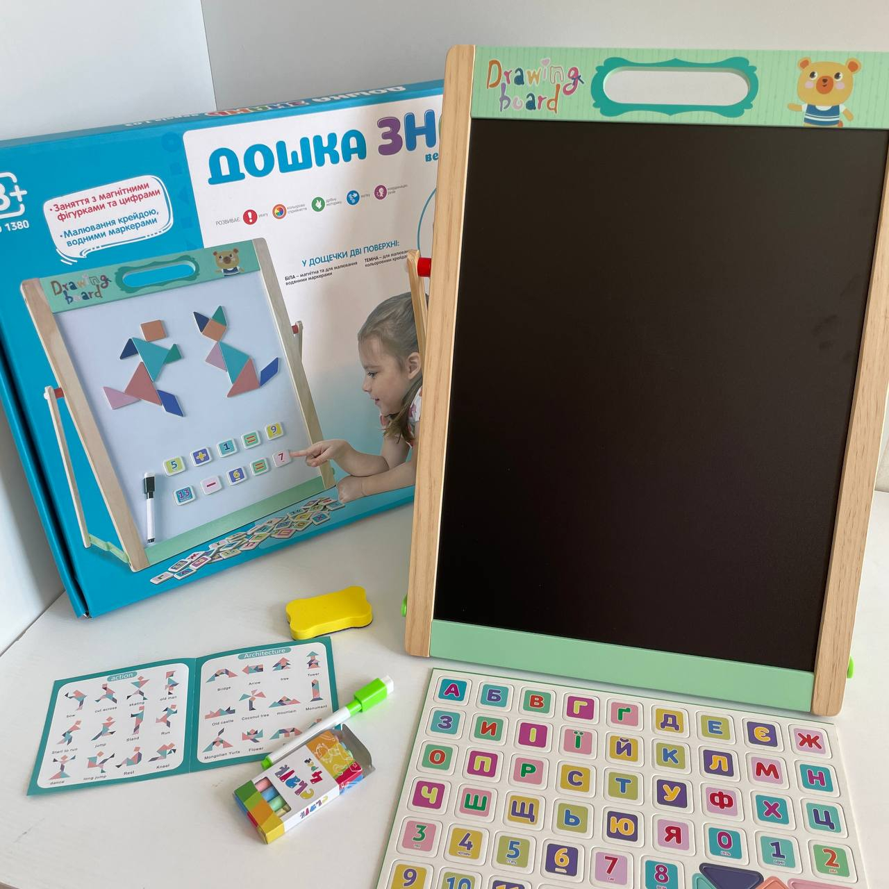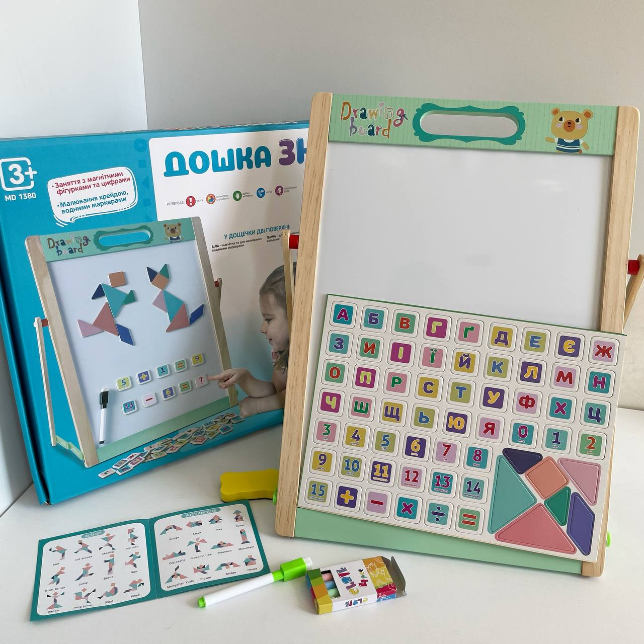 У комплекті: маркер, крейда, губка для стирання сухого маркера та крейди, магнітні літери (англійський алфавіт), цифри, а також магнітний танграм зі схемами для збирання.