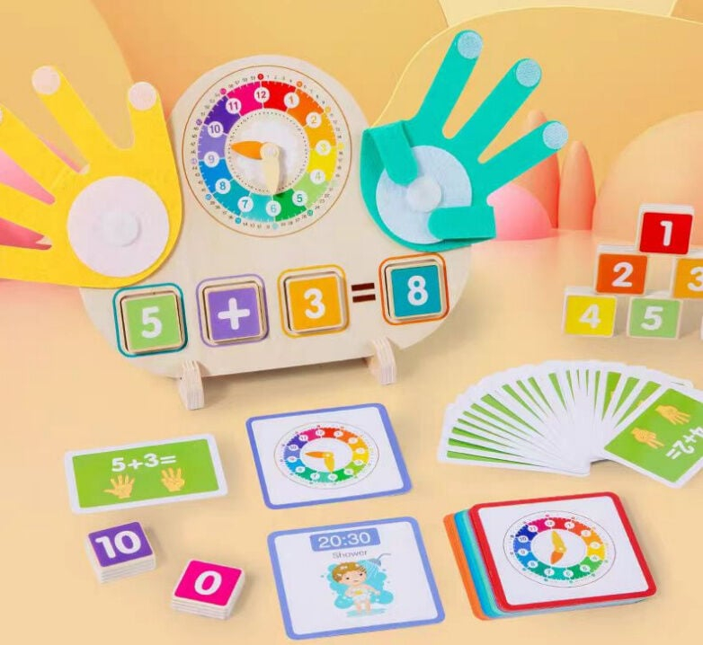Математична дошка Пальчики рахуй: двосторонні кубики з цифрами, годинник із рухомими стрілками, картки із прикладами та розпорядком дня англійською, долоні з липучками, в коробці