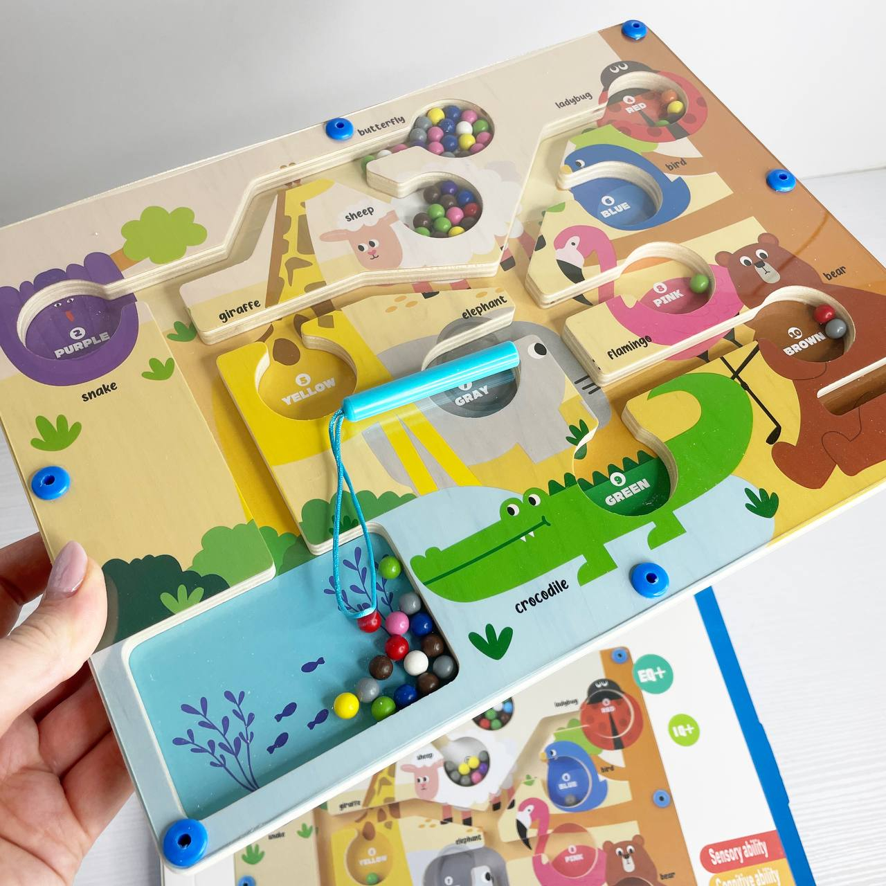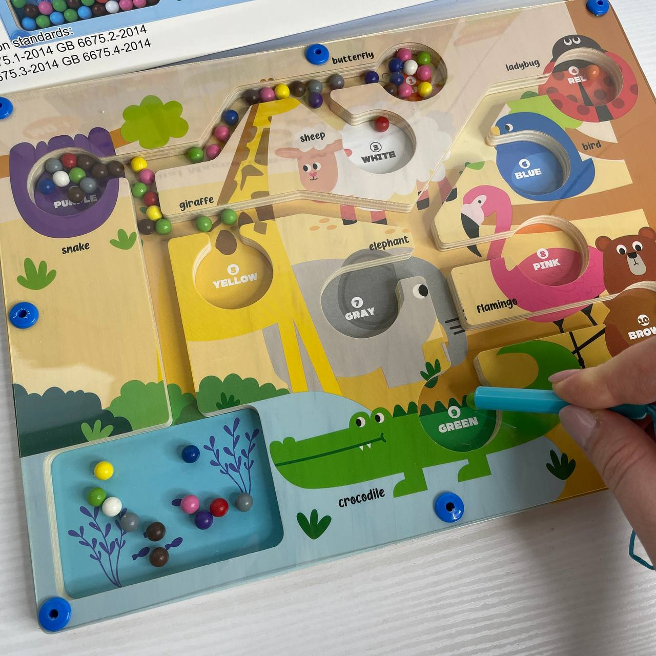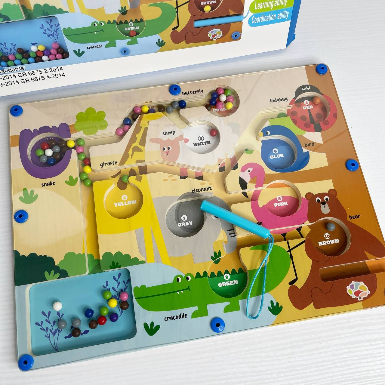 Дерев'яна магнітна гра лабіринт та сортер для кульок, кольори і назви тваринок англійською, магнітний стилус C 75598
