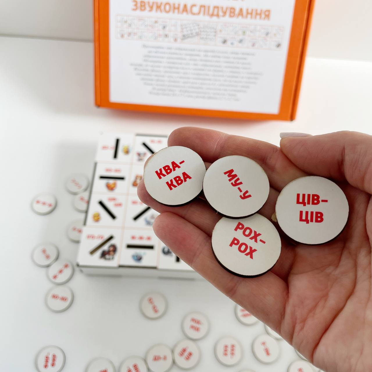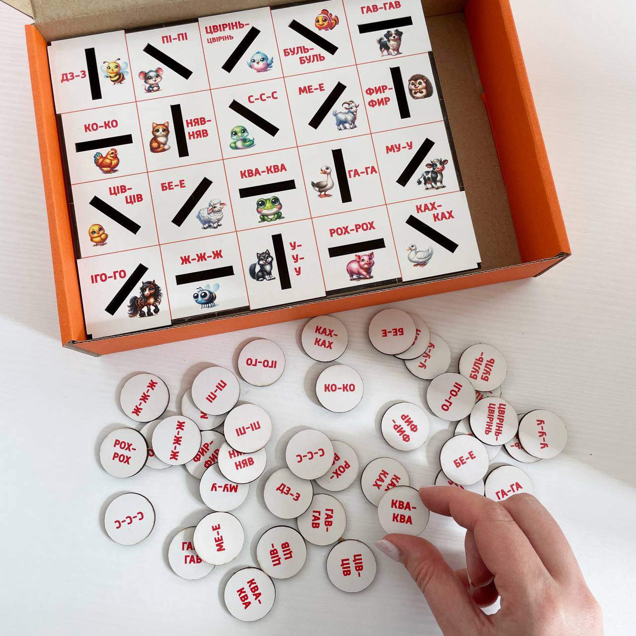 Гра також передбачає використання фішок. Спочатку візьміть одну, промовте звук, який вона символізує, і попросіть дитину знайти на коробці тварину чи об'єкт, що видає такий звук. Потім запропонуйте малюкові повторити звук. Після успішної взаємодії передайте фішку дитині — нехай вона самостійно кине її у відповідний отвір на коробці.