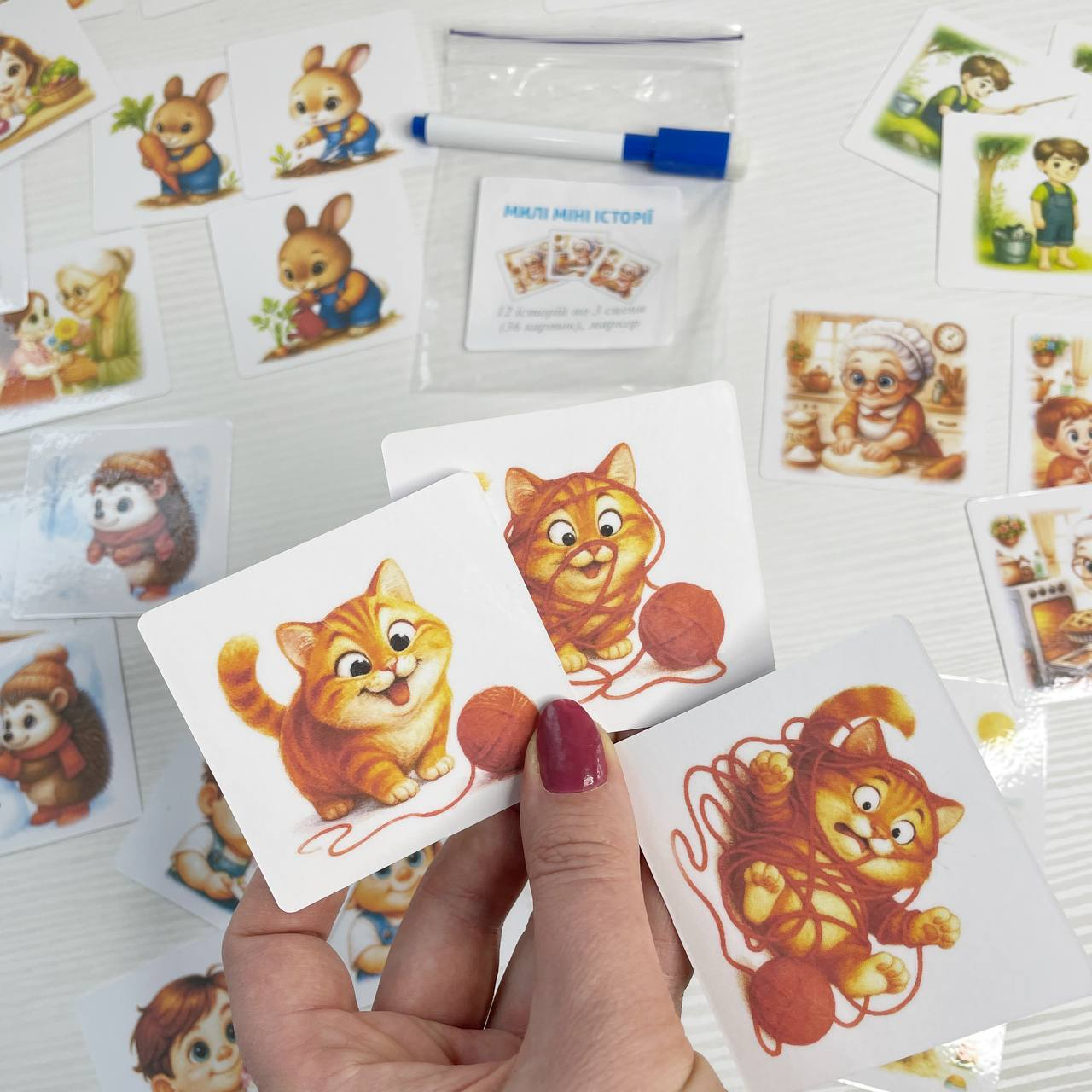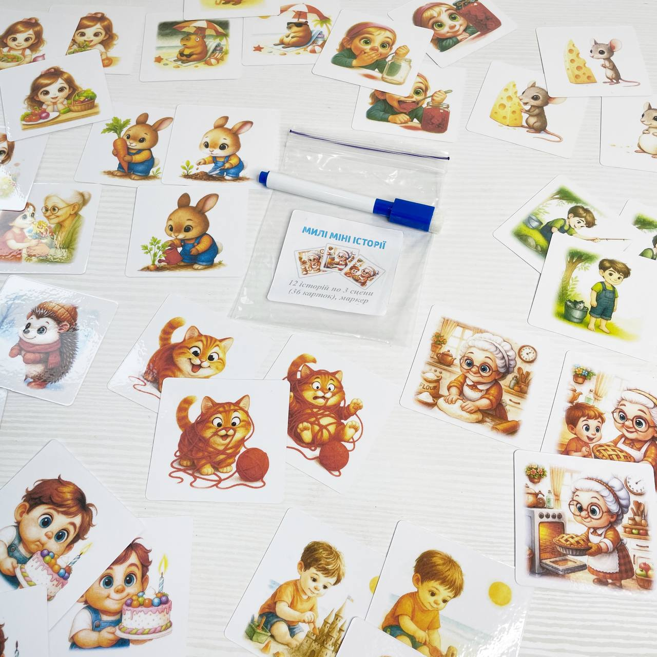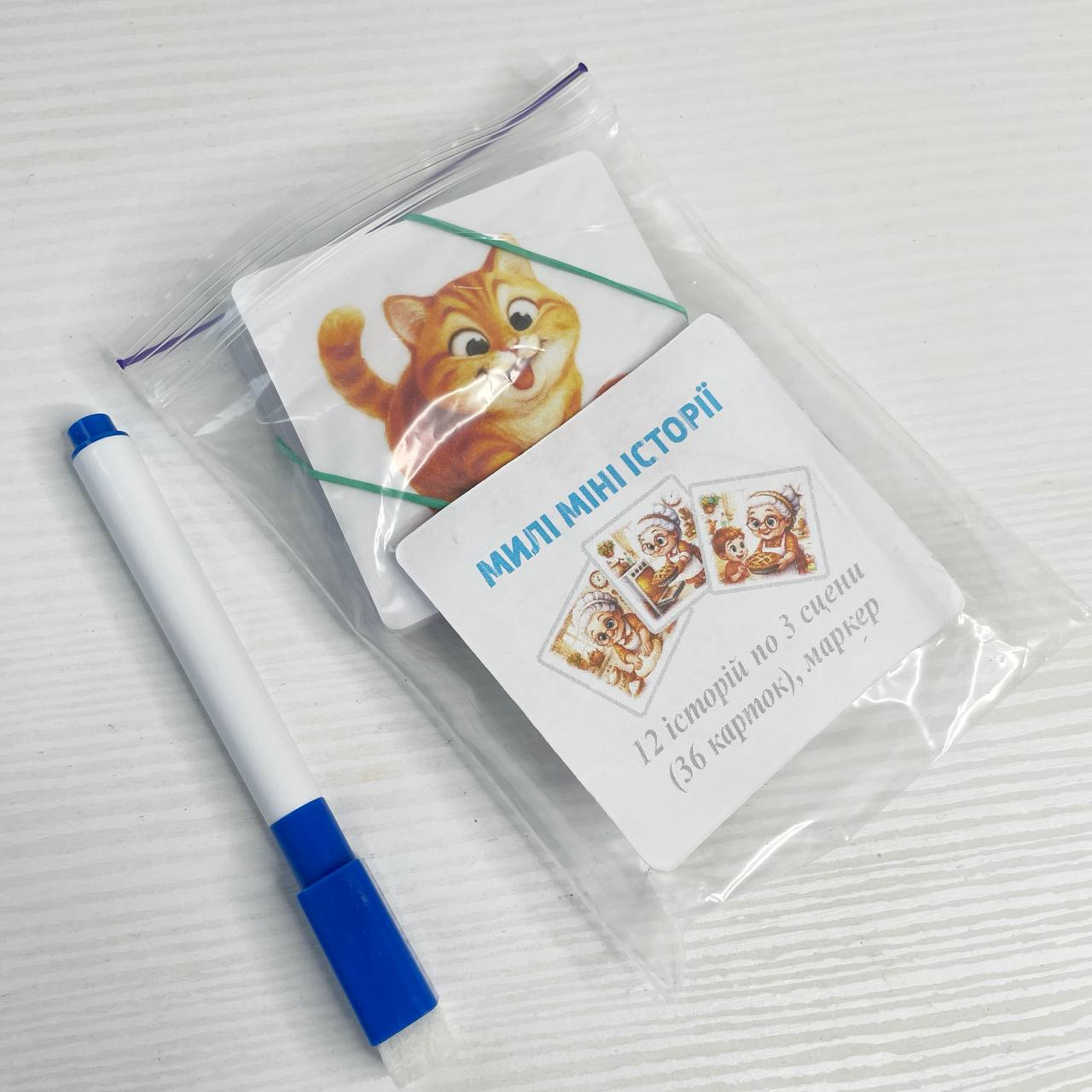 Включає в себе 12 історії по 3 сцени(36 карток)+ маркер. На картах можна писати стираними маркерами. упаковка зіп-пакет.