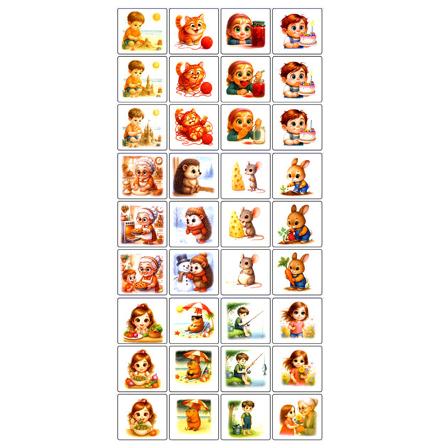 Карти для навчання навикам логічного складу історії. Розвиває навики групування, класифікації та дрібної моторики, а також покращує мовні навики. Потрібно правильно розсортувати 3 карти в логічному порядку, щоб вийшла історія.