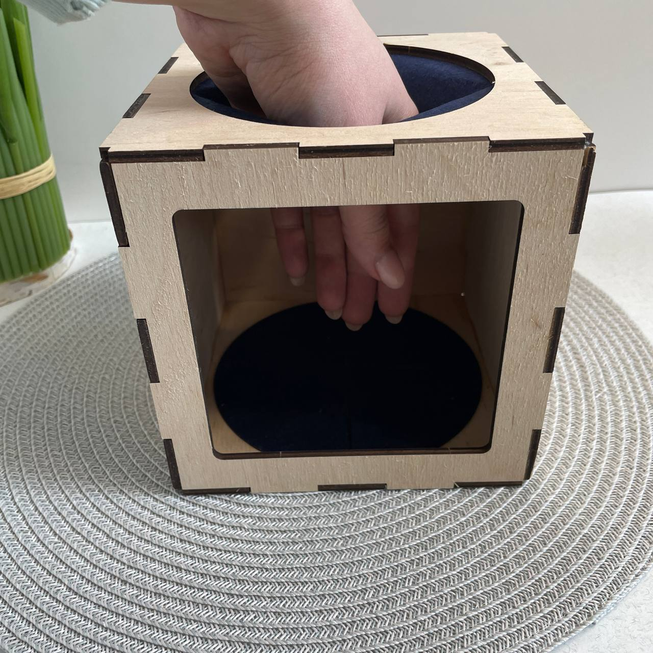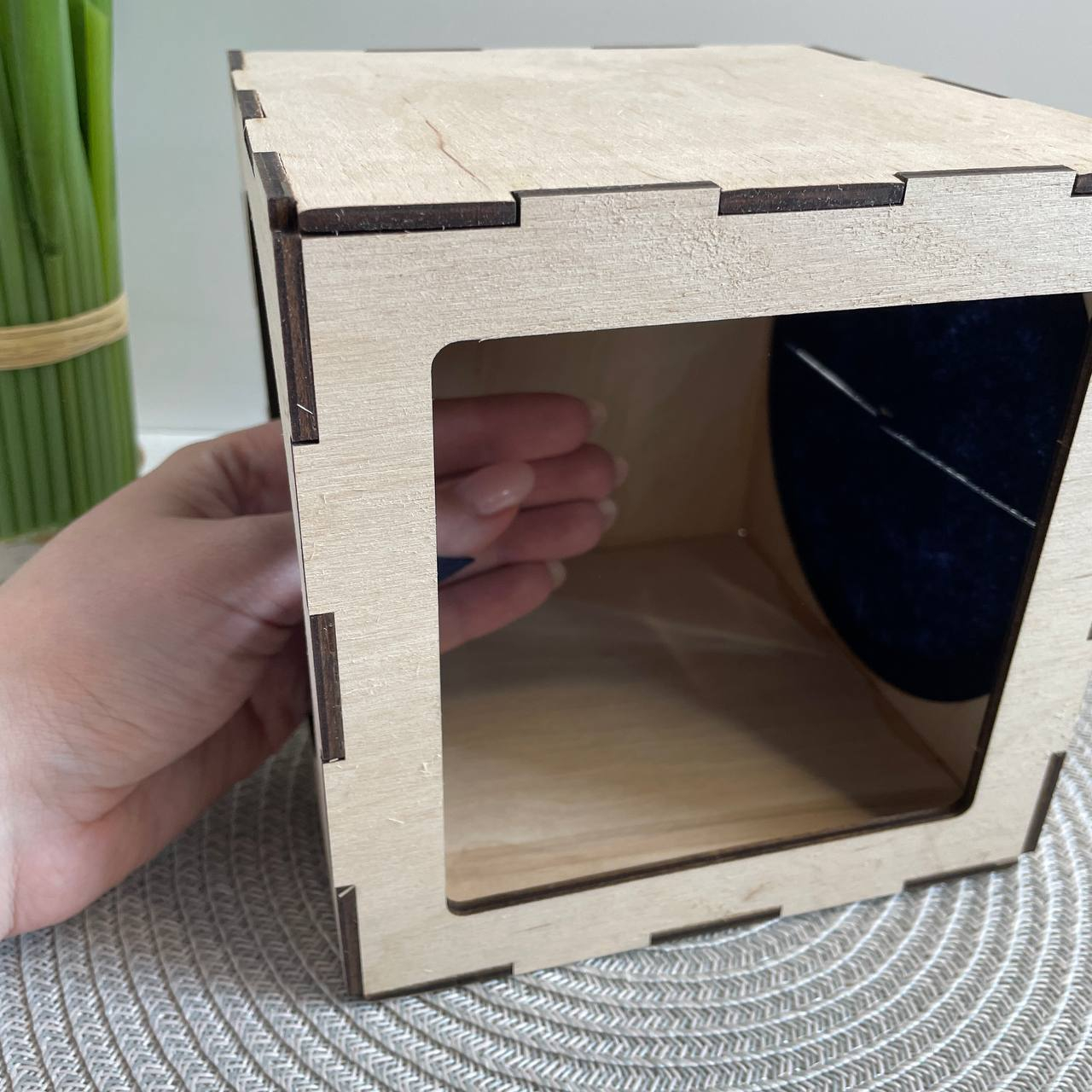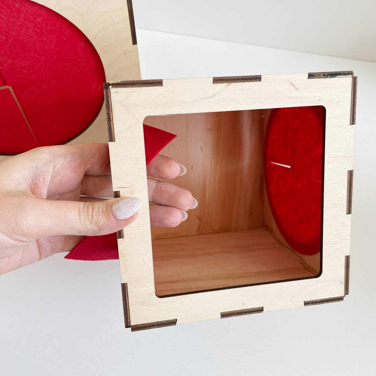 У дерев’яній коробочці є “вікно”, через яке складаються предмети, а з боків прорізи, в які дитині зручно просунути ручки.