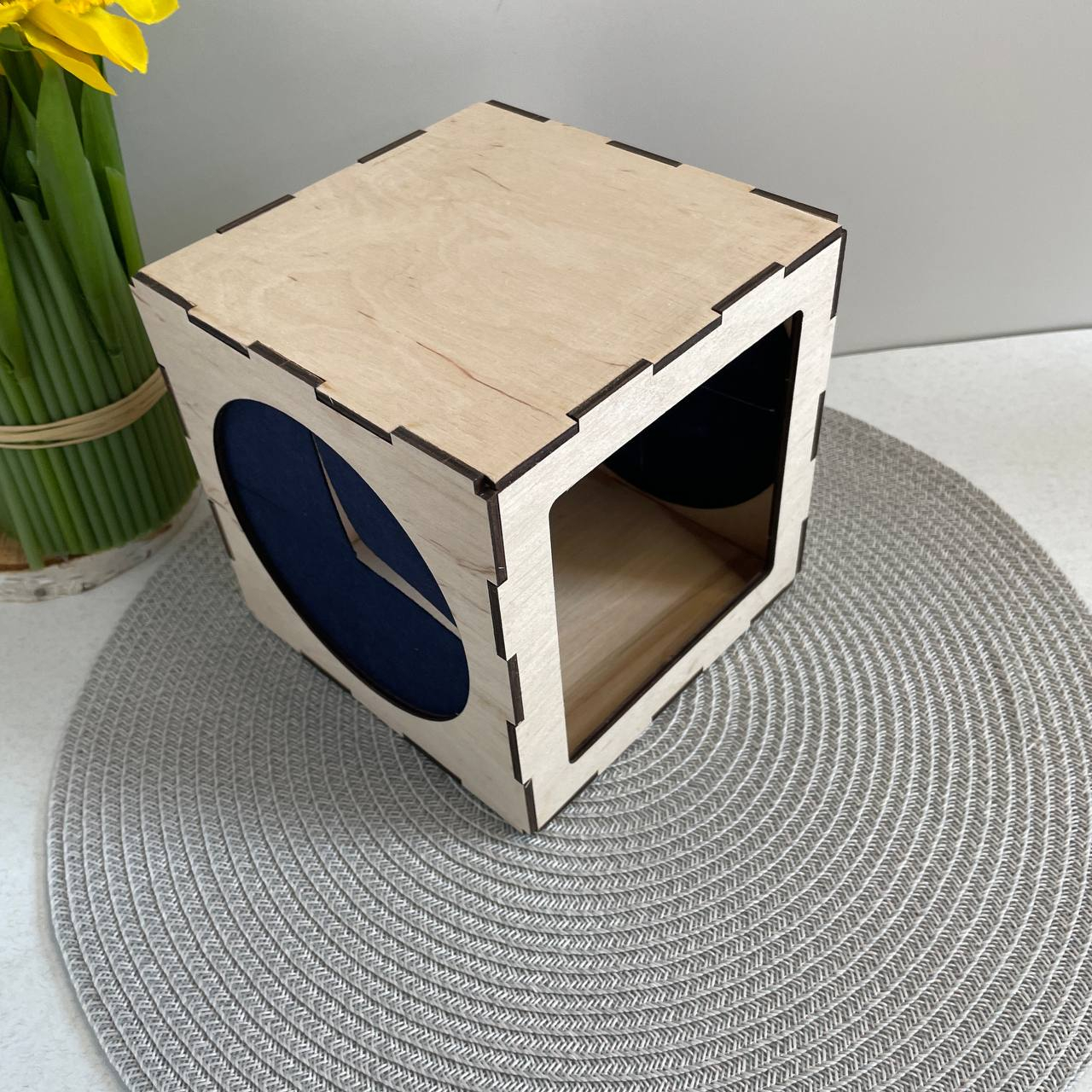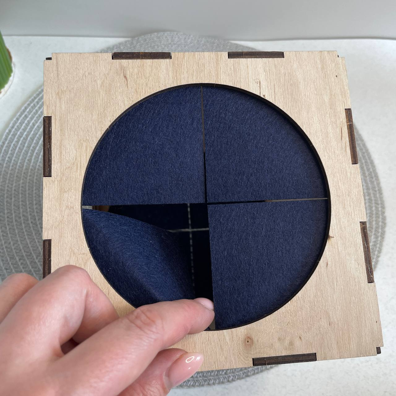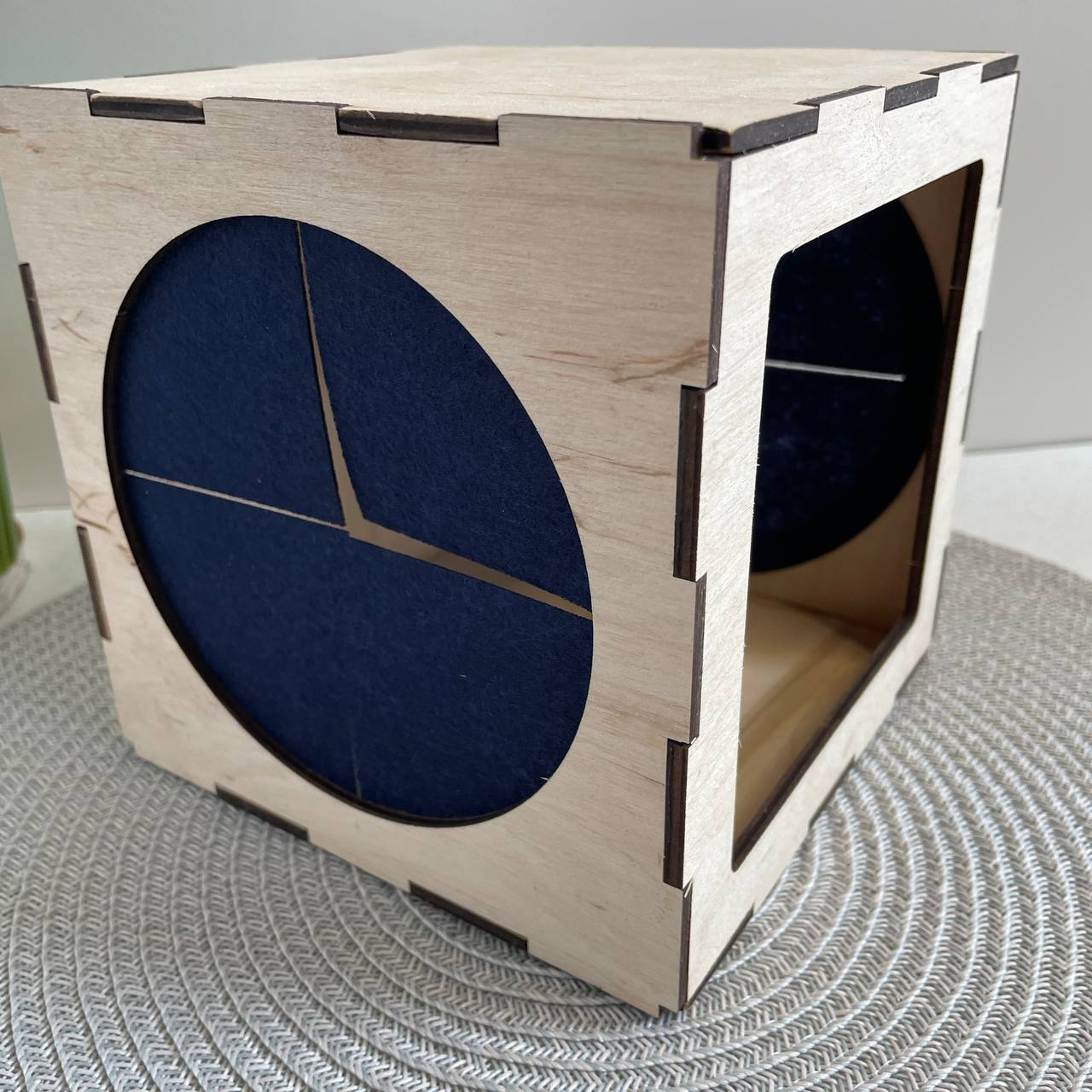 У дерев’яній коробочці є “вікно”, через яке складаються предмети, а з боків прорізи, в які дитині зручно просунути ручки.