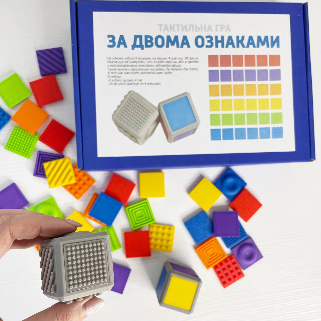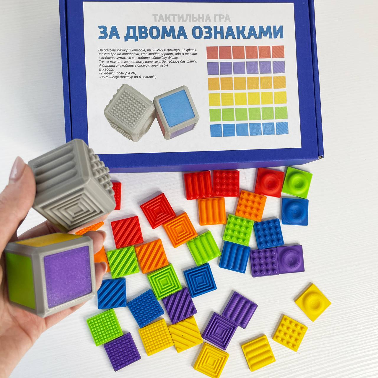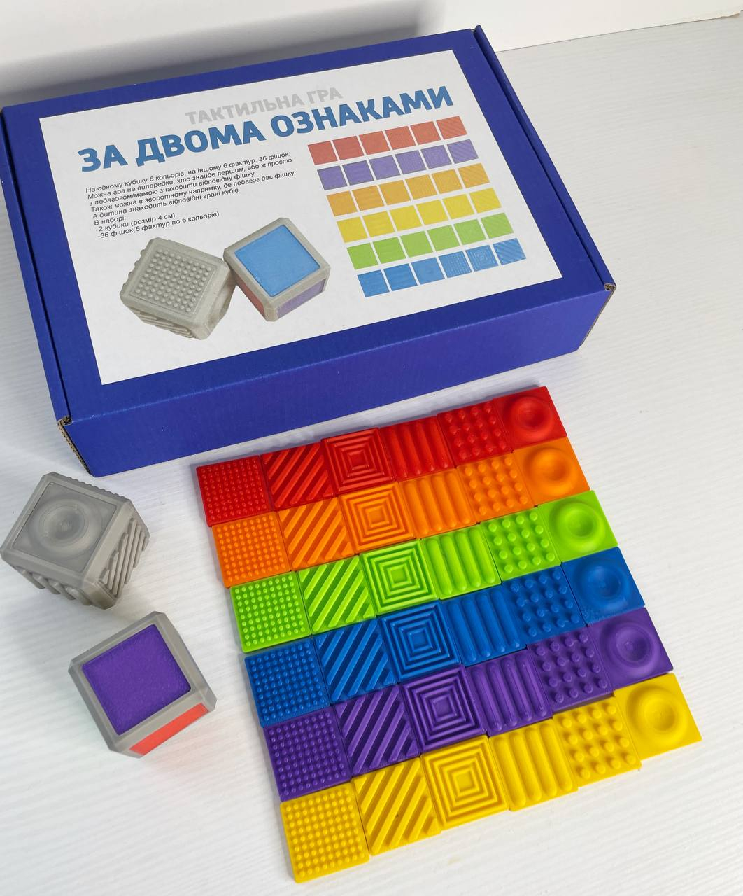2 кубики (розмір 4см)+36 фішок(6фактур по 6 кольорів)