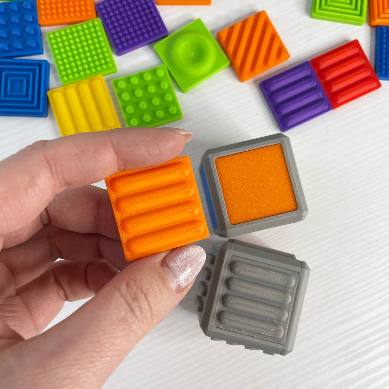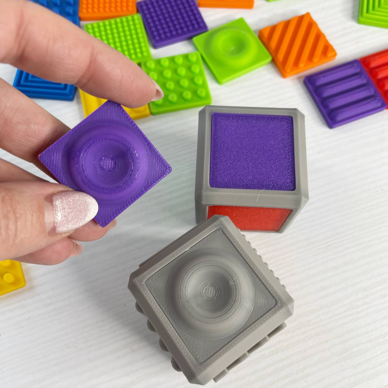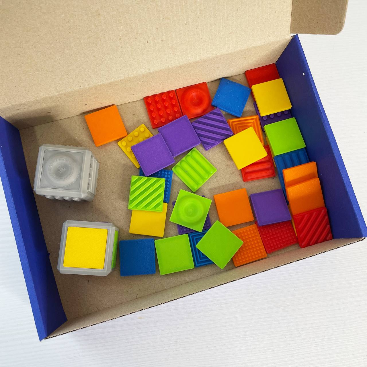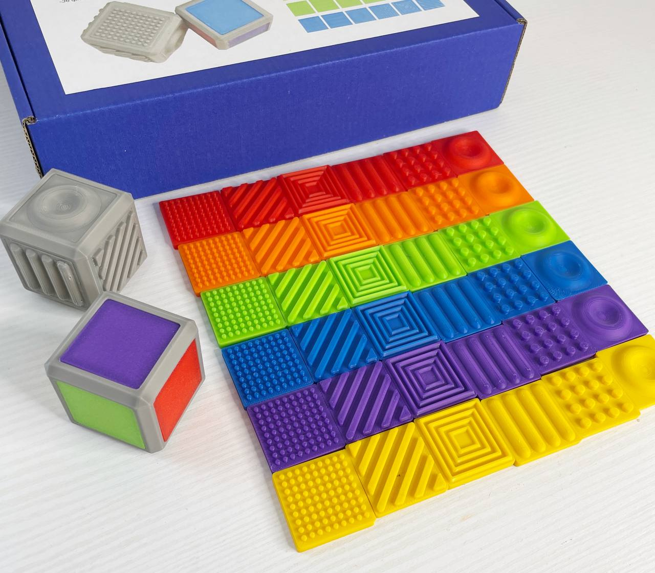 2 кубики (розмір 4см)+36 фішок(6фактур по 6 кольорів)