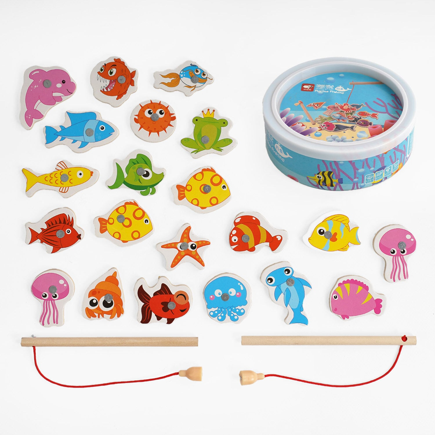 Дерев'яна магнітна риболовля у відрі (22 фігурки та 2 вудочки)
