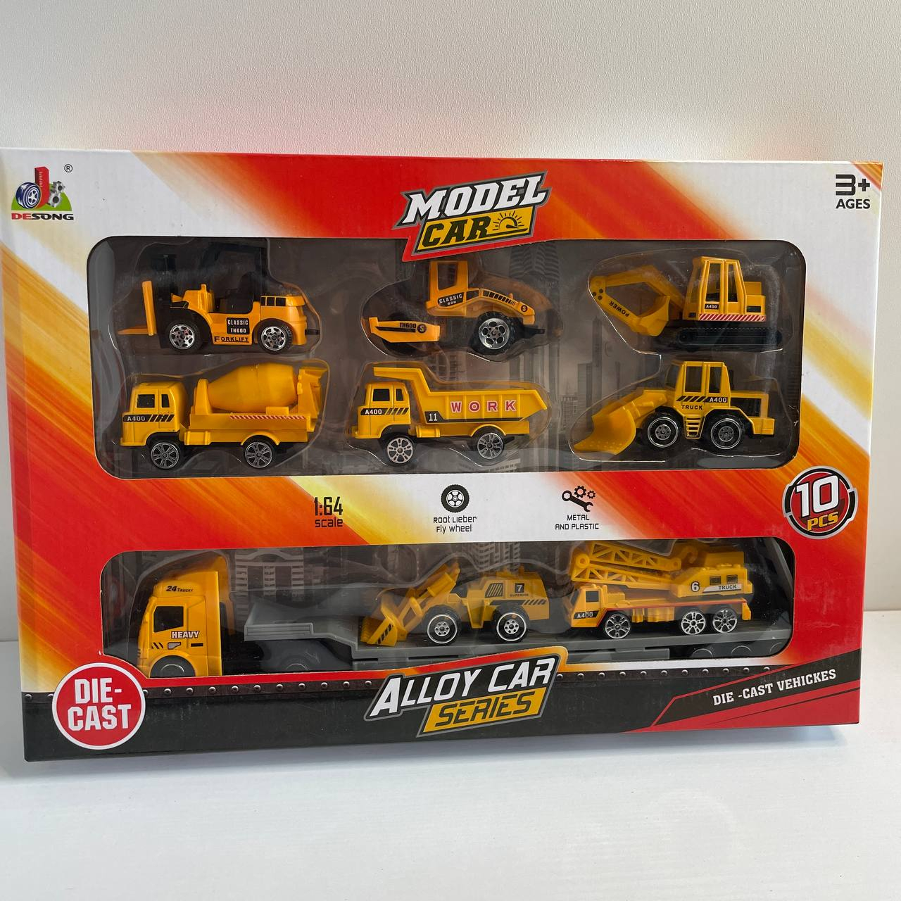Набір металевих машинок. 9 видів транспорту + причіп до тягача (автовоз). 1:64