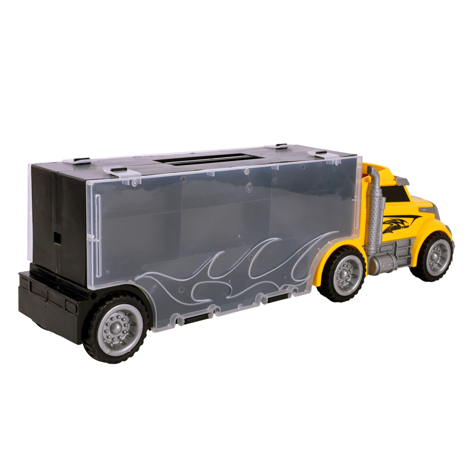 • Прозорий контейнер з відділеннями забезпечує акуратне зберігання та перевезення маленьких автомобілів.