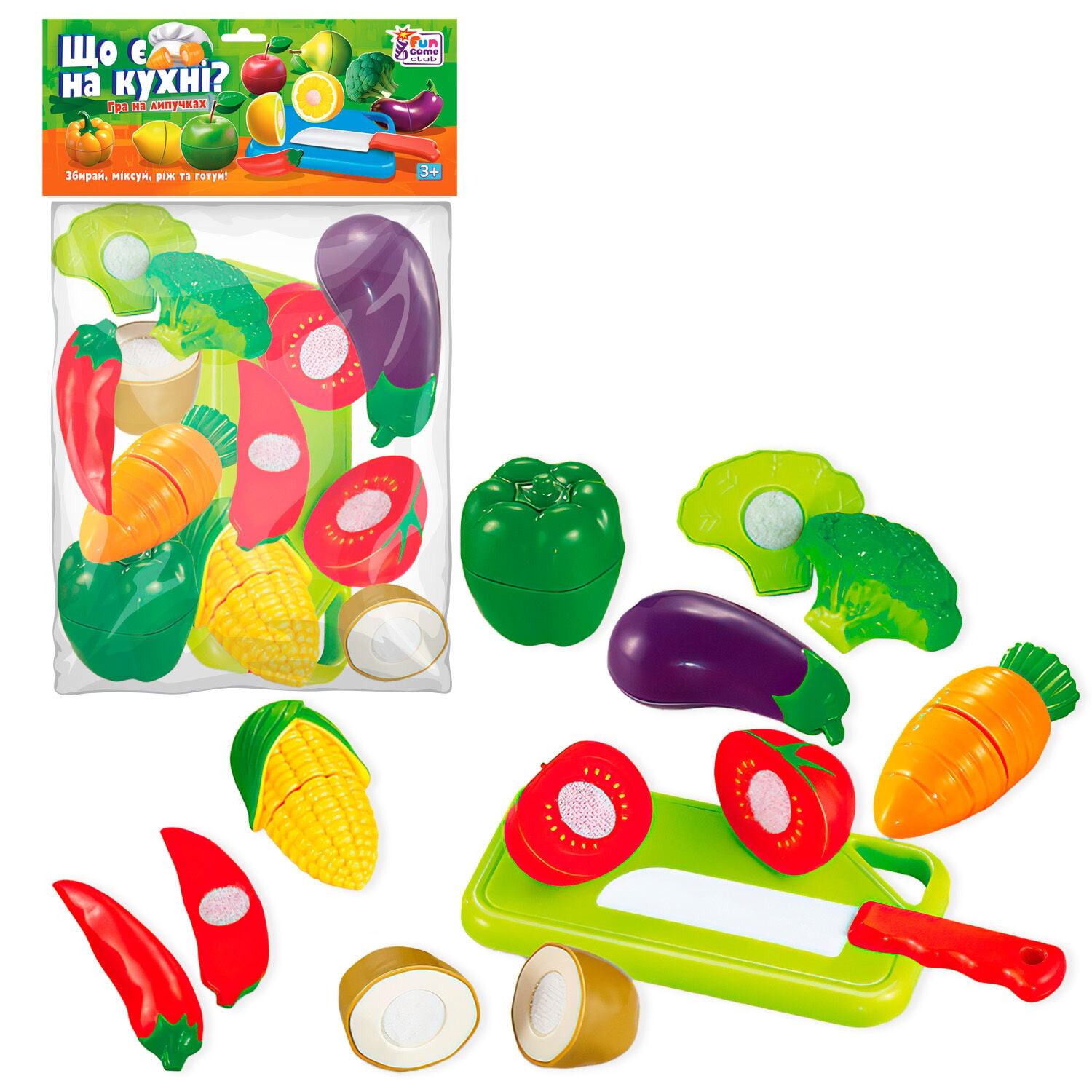 Набір дитячий ігровий Овочі на липучках з дошкою та ножем 65262 Ця гра включає маленькі фігурки овочів, які складаються з кількох частин і кріпляться між собою за допомогою липучок. Вона допомагає дитині вчитися користуватися ножем у безпечній формі, запам’ятовувати нові слова, сортувати овочі та фрукти за кольорами чи характеристиками, а також дізнаватися корисні властивості продуктів.