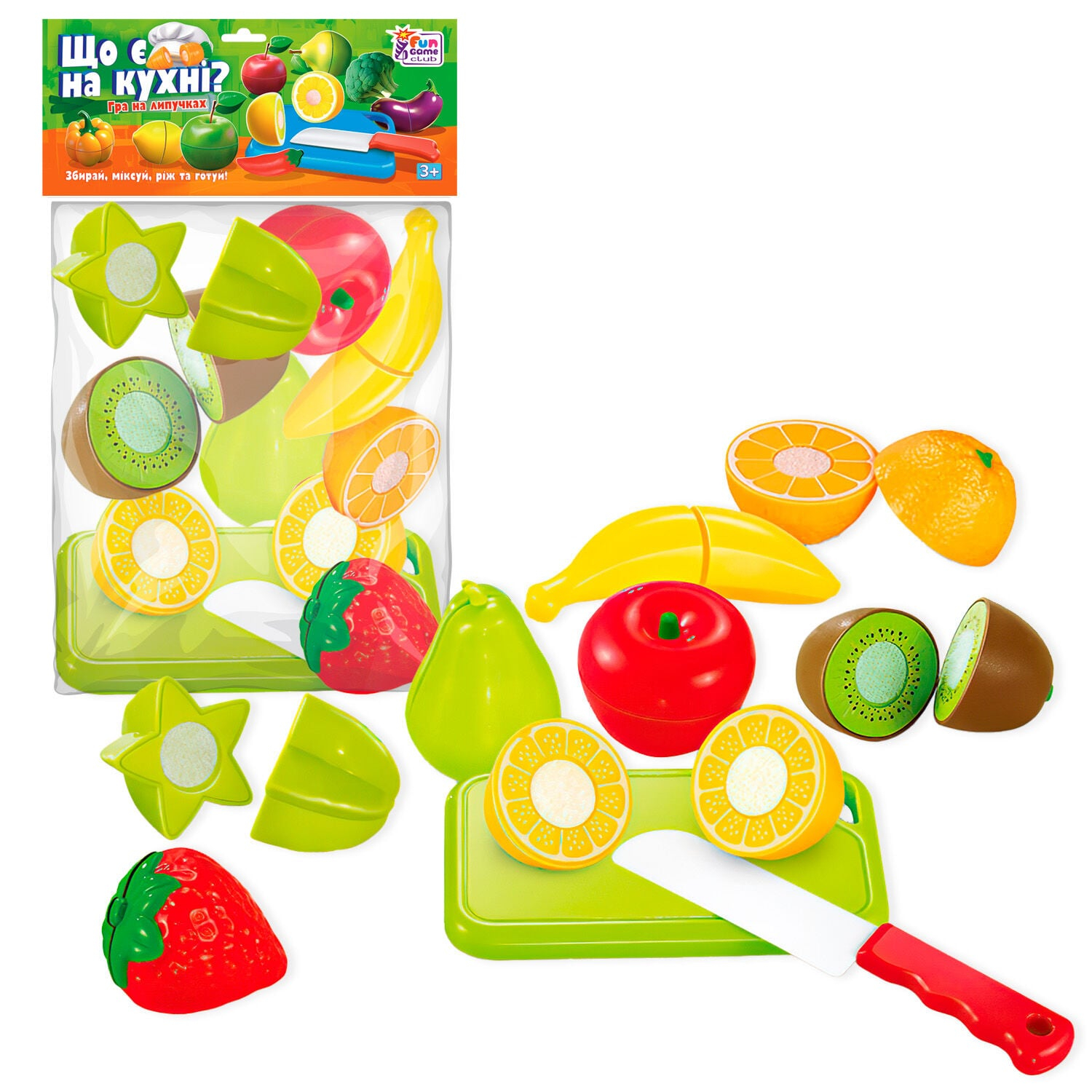 Пластикові Фрукти на липучках “Що є на кухні?” 10 елементів, обробна дошка, ніж, у пакеті 65260