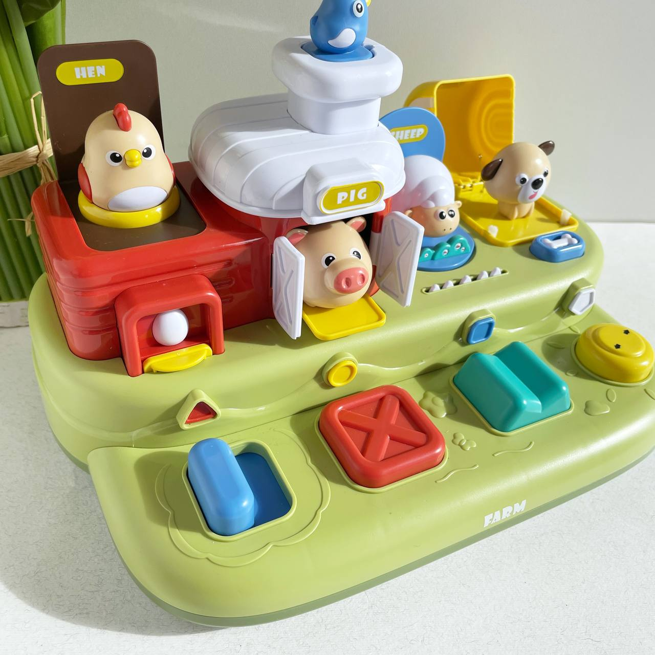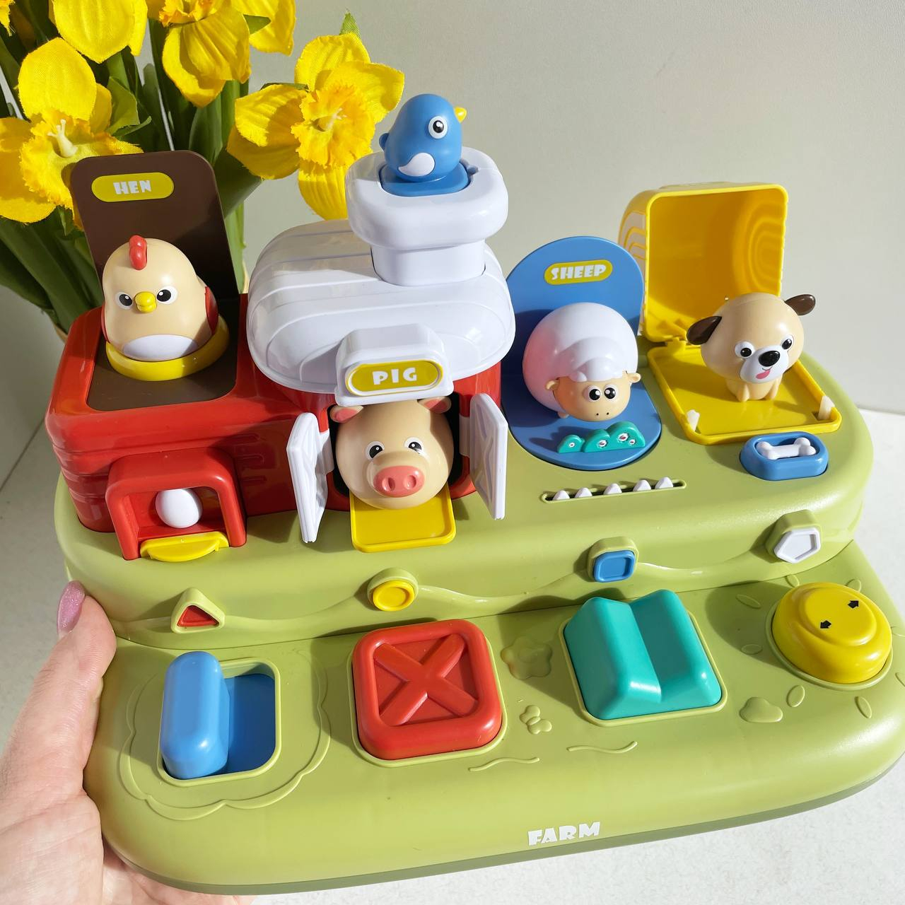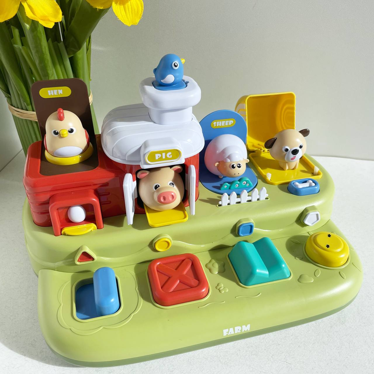Логічна навчальна іграшка має 4 кнопки, які потрібно натиснути, переключити або провернути, щоб відкрити будиночки, в яких ховаються курочка, свинка, овечка та собачка.