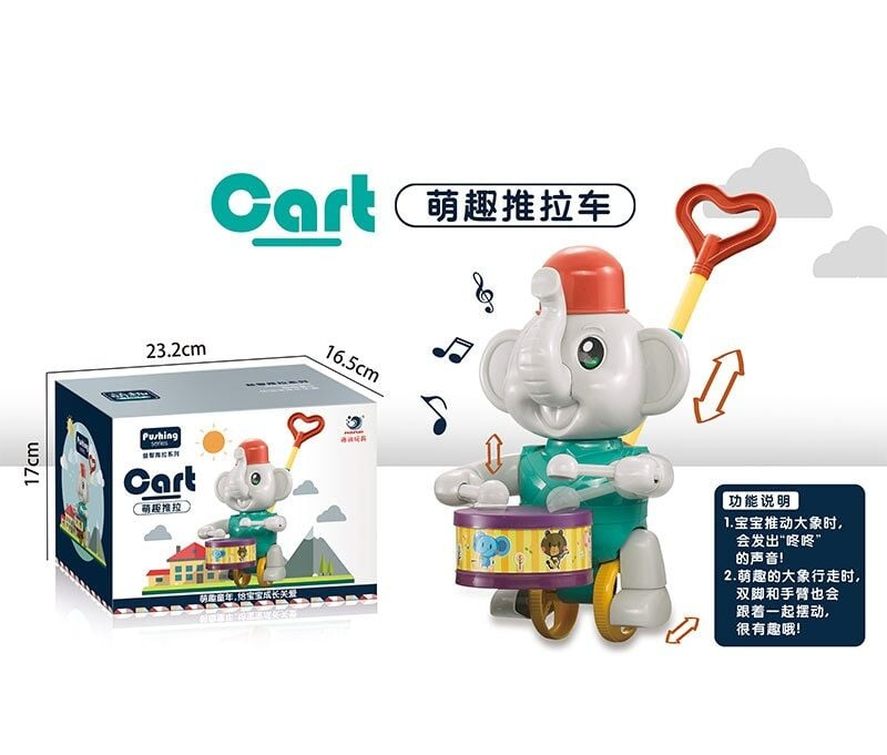 Ця яскрава іграшка-каталка у формі слоненятка стане справжньою радістю для енергійної малечі! Під час руху вона видає мелодійні звуки завдяки слоненятку, яке б’є по барабану, привертаючи увагу дитини. Зручна ручка у формі сердечка ідеально підходить для маленьких долоньок, стимулюючи дитину тягнути іграшку за собою, тим самим сприяючи розвитку моторики та координації рухів. Це чудовий компаньйон для перших прогулянок вашого малюка!