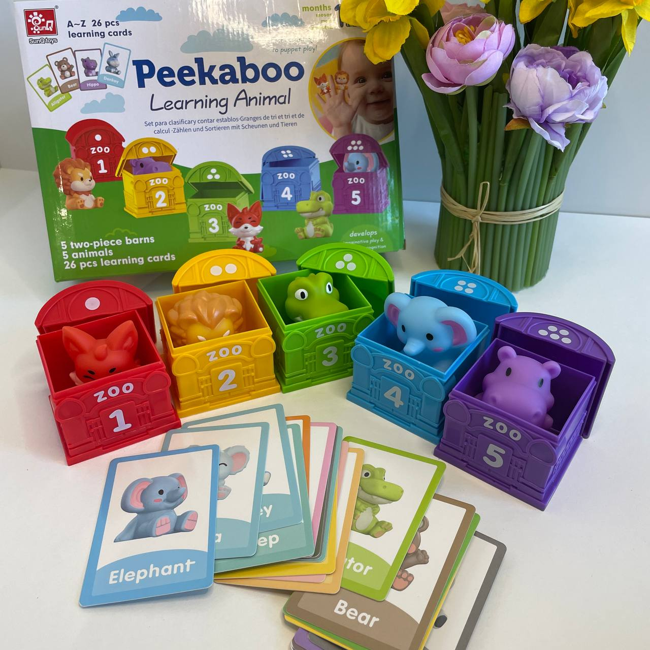 Цей багатофункціональний набір для раннього розвитку малюка дозволяє дитині дізнатися багато нової інформації у форматі цікавої гри. Будиночки є пронумерованими, тому дитина познайомиться з основами лічби, також до набору додані картки з англійською абеткою та назвами різноманітних тваринок нею ж.