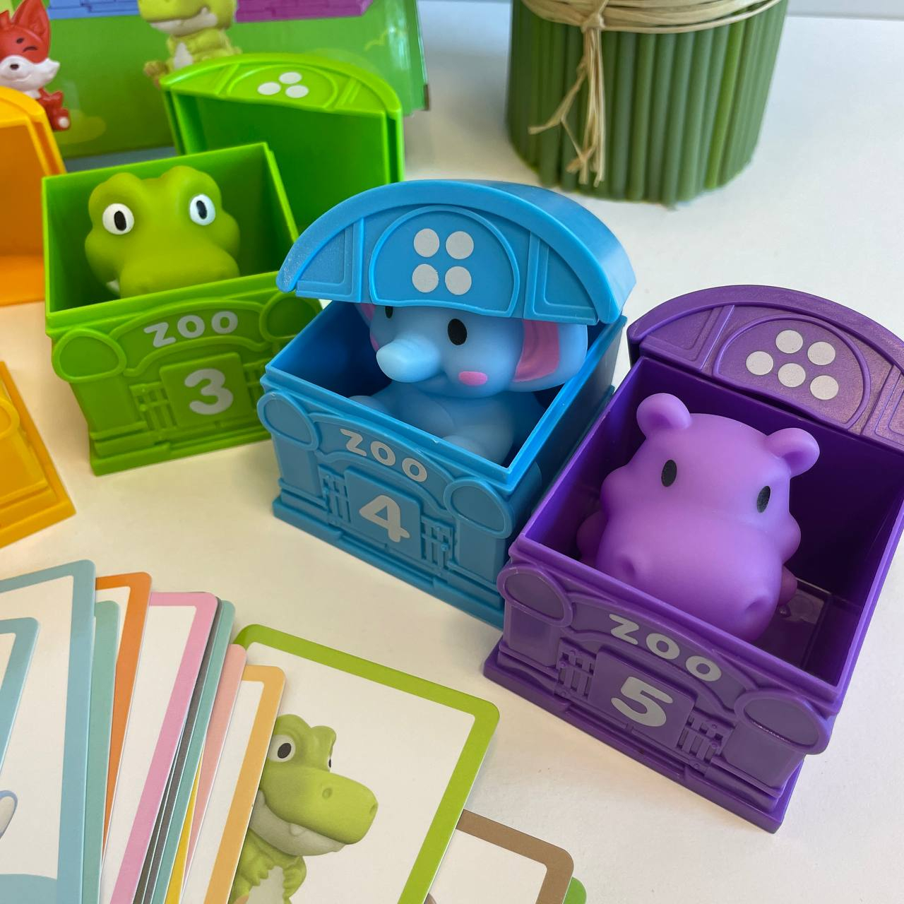 - до набору включено п’ять пронумерованих будиночків, у яких ховаються фігурки тварин;
