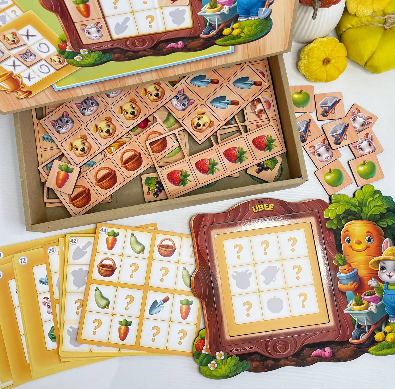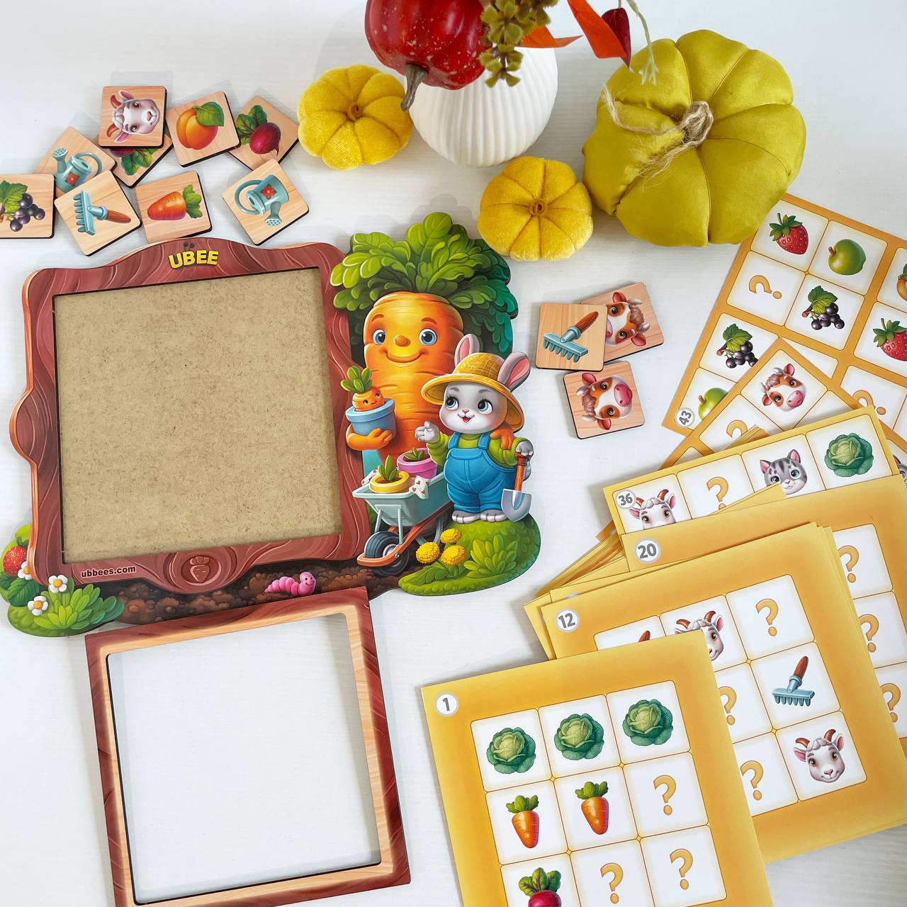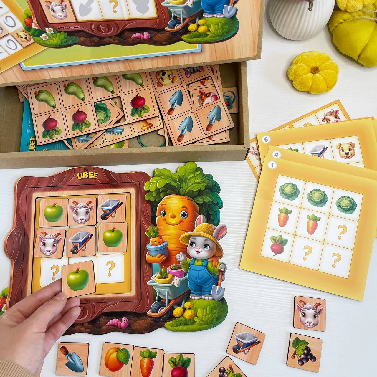 Завдяки зображенням овочів, фруктів, тварин та інструментів — гру легко адаптувати до повсякденного життя малюка.