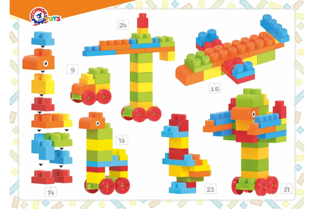 У наборі 100 великих деталей, зручних для діточок вже від 2-х років. Цеглини зі зрізаними кутами для кораблів чи потішних тваринок. Платформи з колесами – взагалі знахідка. Можна збудувати автомобіль, потяг чи літак. А ще платформа стане в пригоді при конструюванні роботів.