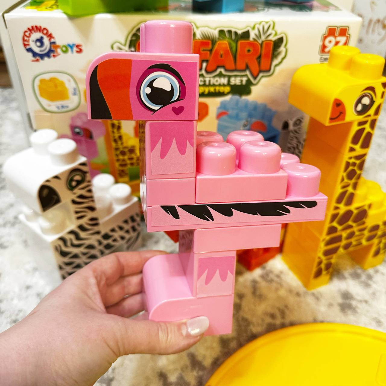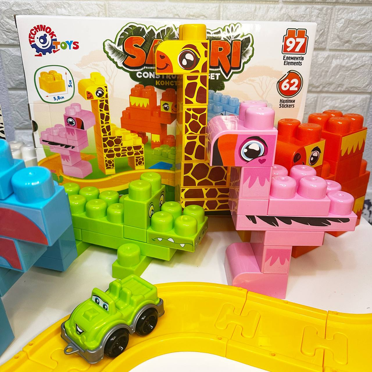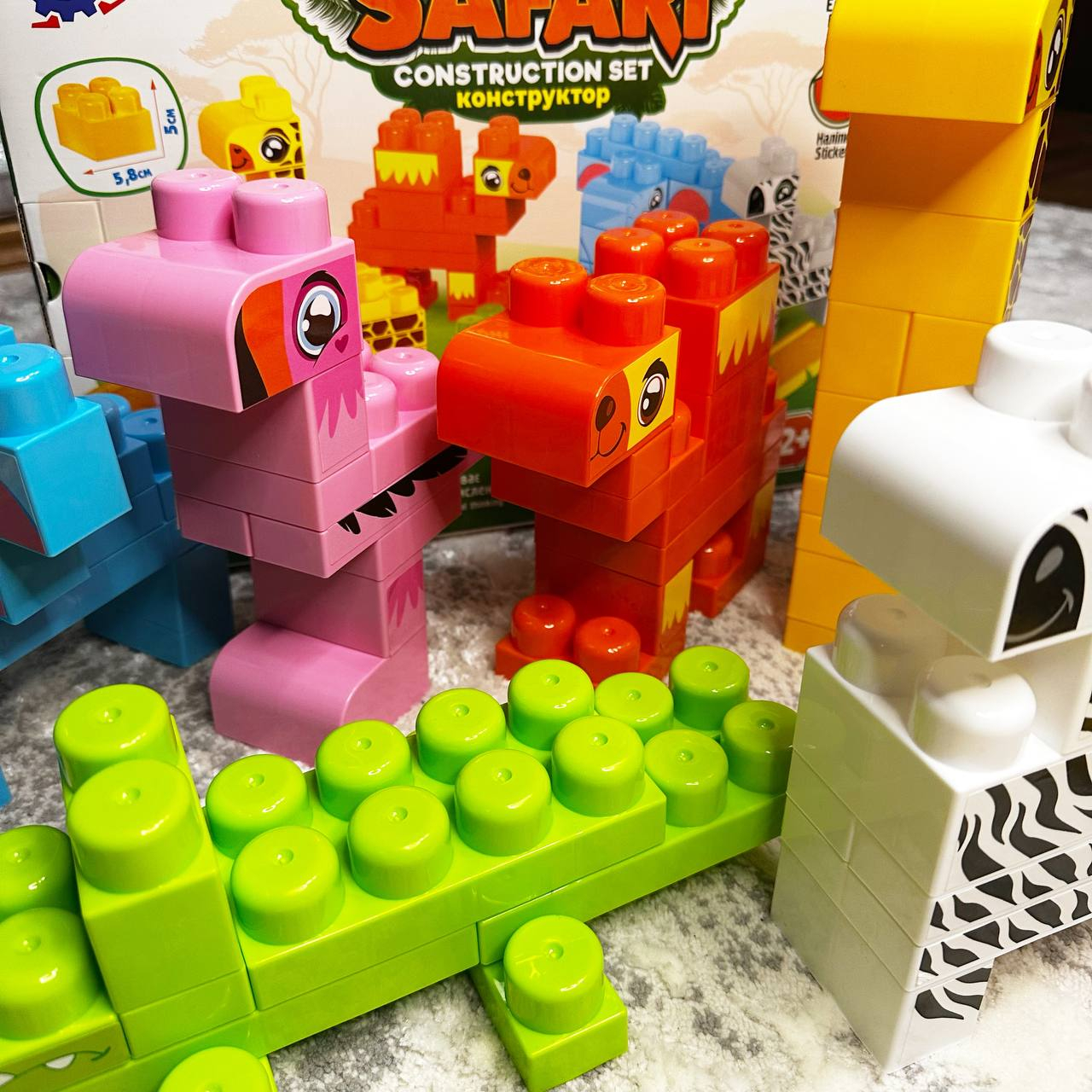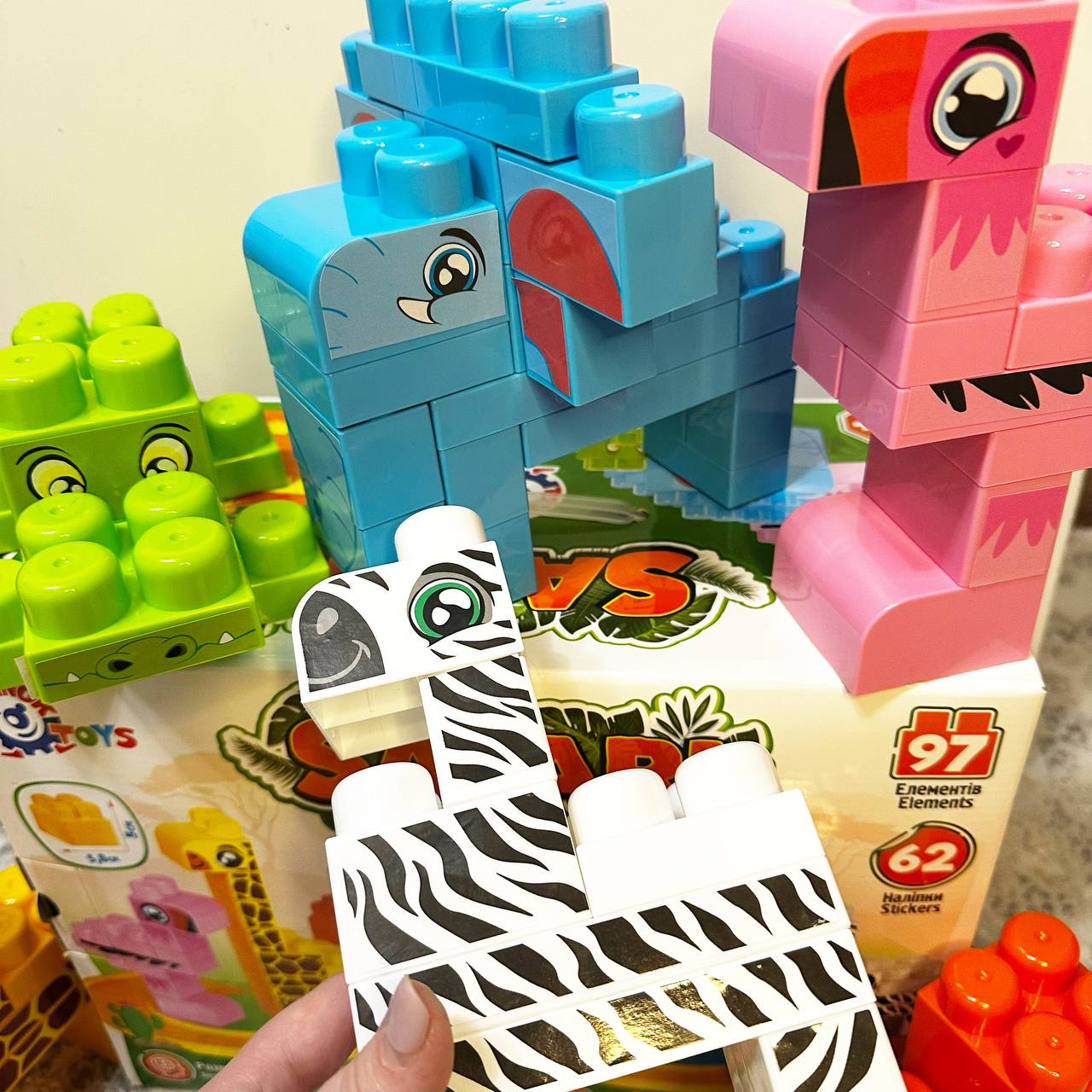 Жираф, фламінго, крокодил, слон, верблюд та зебра - кожна з цих чудових тварин може оживати в руках вашої дитини. Чудова можливість розкрити свою творчість та фантазію в процесі складання. Додатково до конструктора надаються 62 наліпки, які допомагають надати тваринкам виразності та реалізму. Це відмінна можливість навчитися деталізації та навіть обрати свою найулюбленішу тваринку. Але гра з конструктором не закінчується лише складанням тваринок. В наборі також міститься дорога і позашляховик, що дає змогу створити різноманітні сценарії гри. Маленькі дослідники можуть вирушити в екзотичну подорож по африканському континенту і познайомитись зі світом тварин.