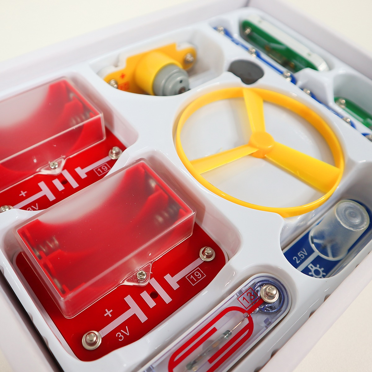 Конструктор пропонує 15 різних схем, для збору яких дитина зможе скористатися провідниками, елементами живлення, вимикачами, лампами і електромоторами, збираючи їх і відкриваючи для себе багато нового і цікавого, при цьому не використовуючи небезпечний метод паяння.