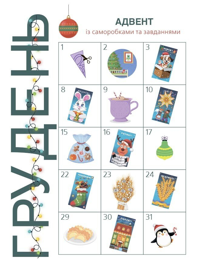 Наш творчий адвент-зошит допоможе організувати сумісне родинне дозвілля та перетворити очікування свят на справжню зимову пригоду. Розгортайте адвент-зошит та створюйте дива власноруч!