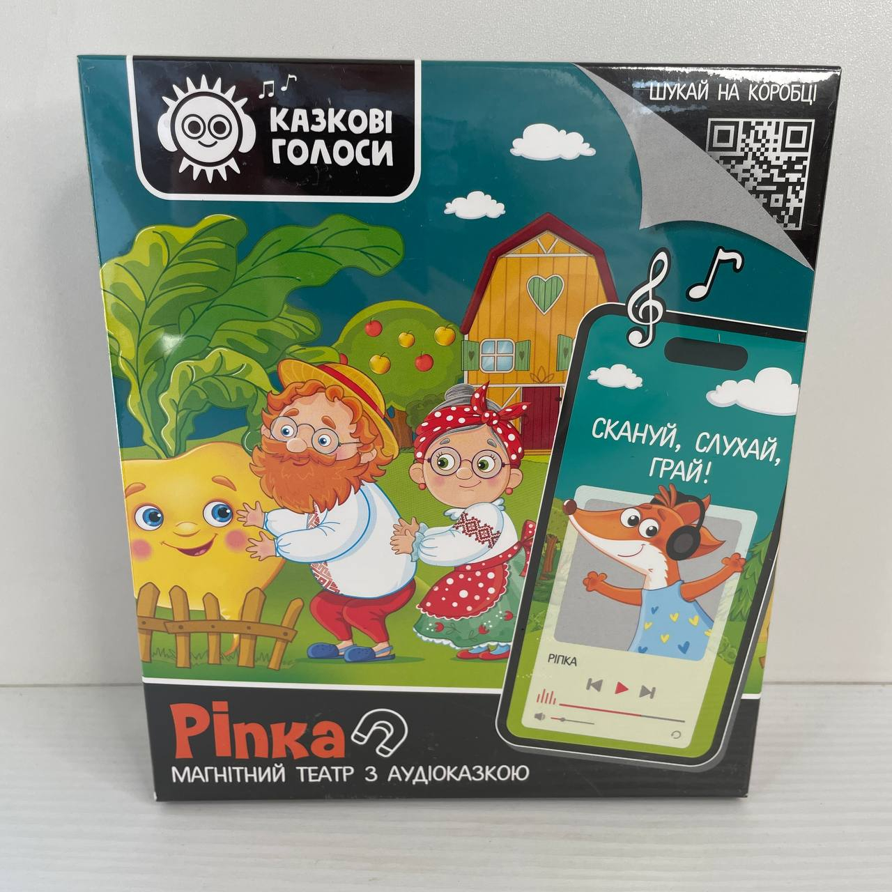 У верхній частині коробки зліва є перфораційна, відривна стрічка шириною 15 мм (на неї вказує стрілка з написом “шукай аудіоказку тут”). Перфораційну, відривну стрічку тянемо праворуч, відриваючи її. Відкриється прихована частина коробки з QR-кодом, на якому навушники. Скануємо QR-код, здійснюється перехід на вебсторінку з аудіоказкою. Під картинкою з героями казки натисніть play і слухайте. При потребі ставте на паузу і регулюйте гучність.
