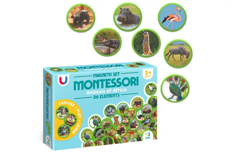 36 магнітів із зображеннями реальних тварин Африки: бегемот, фламінго, крокодил, зебра, гієна, фазан, сурикат та багато інших;
