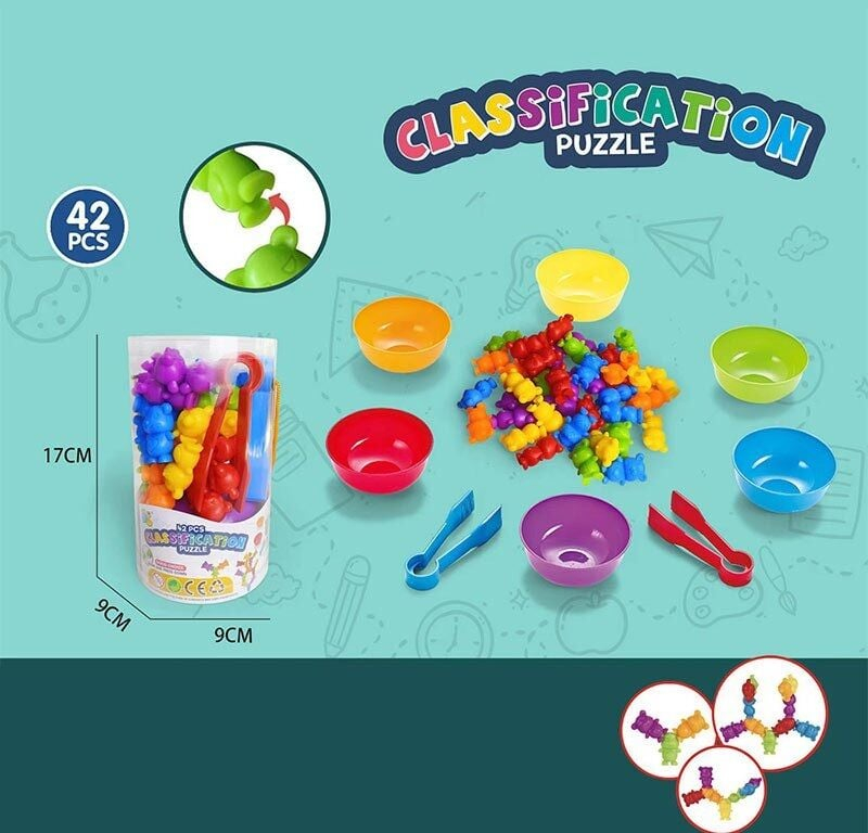 Сортування за кольорами: За допомогою зручних щипців дитина розкладає яскравих ведмедиків у відповідні піали. Це чудово тренує координацію та допомагає швидко запам’ятати кольори.