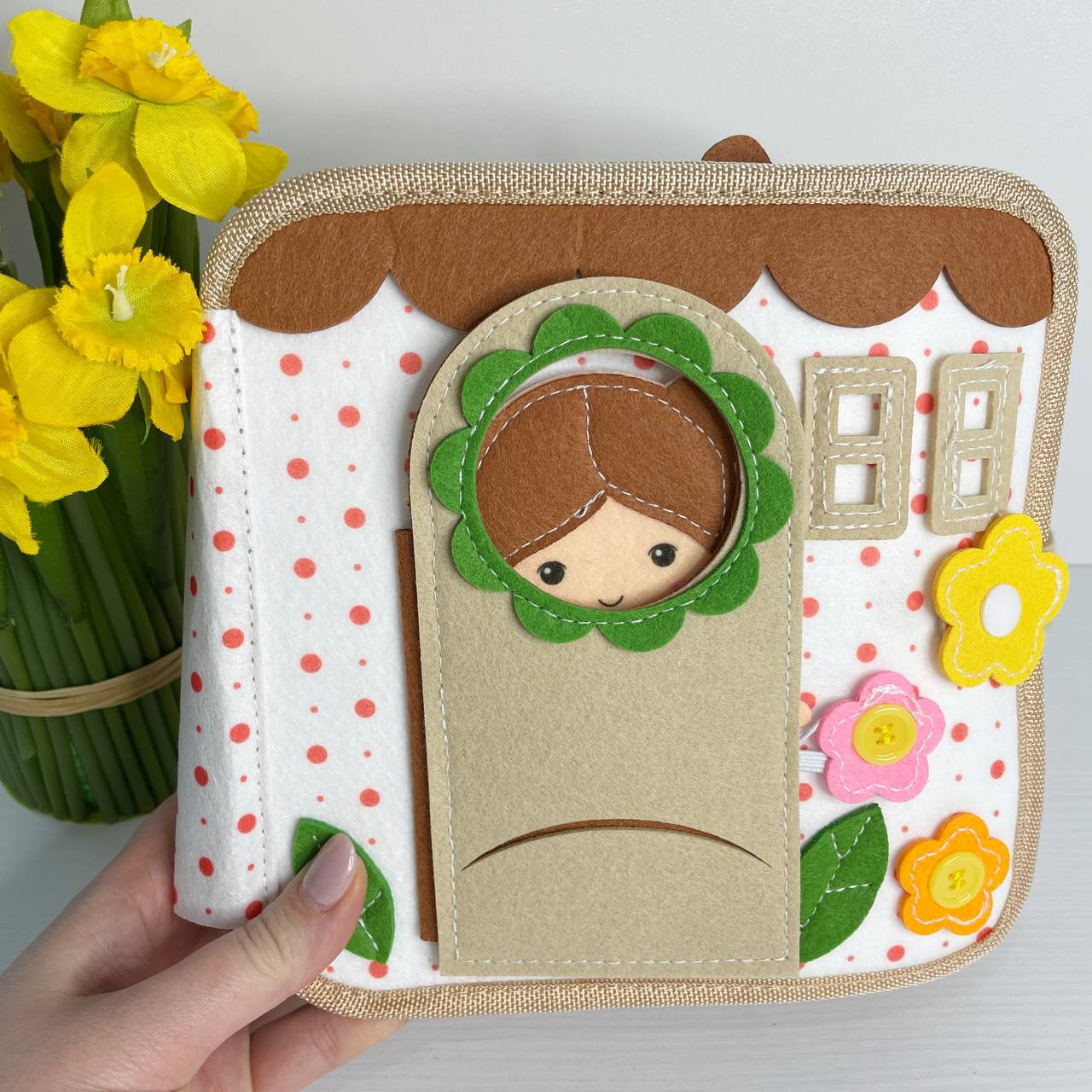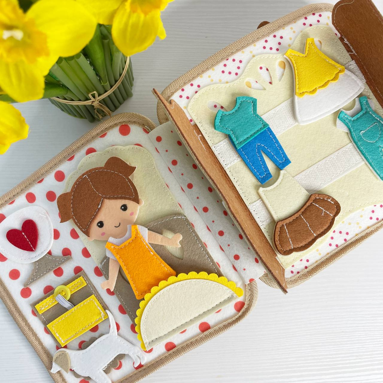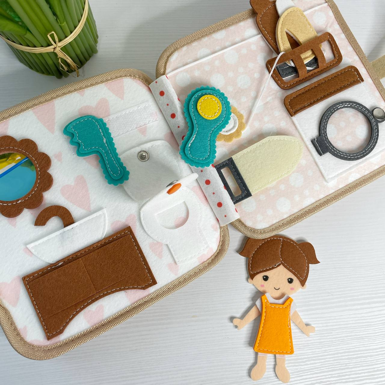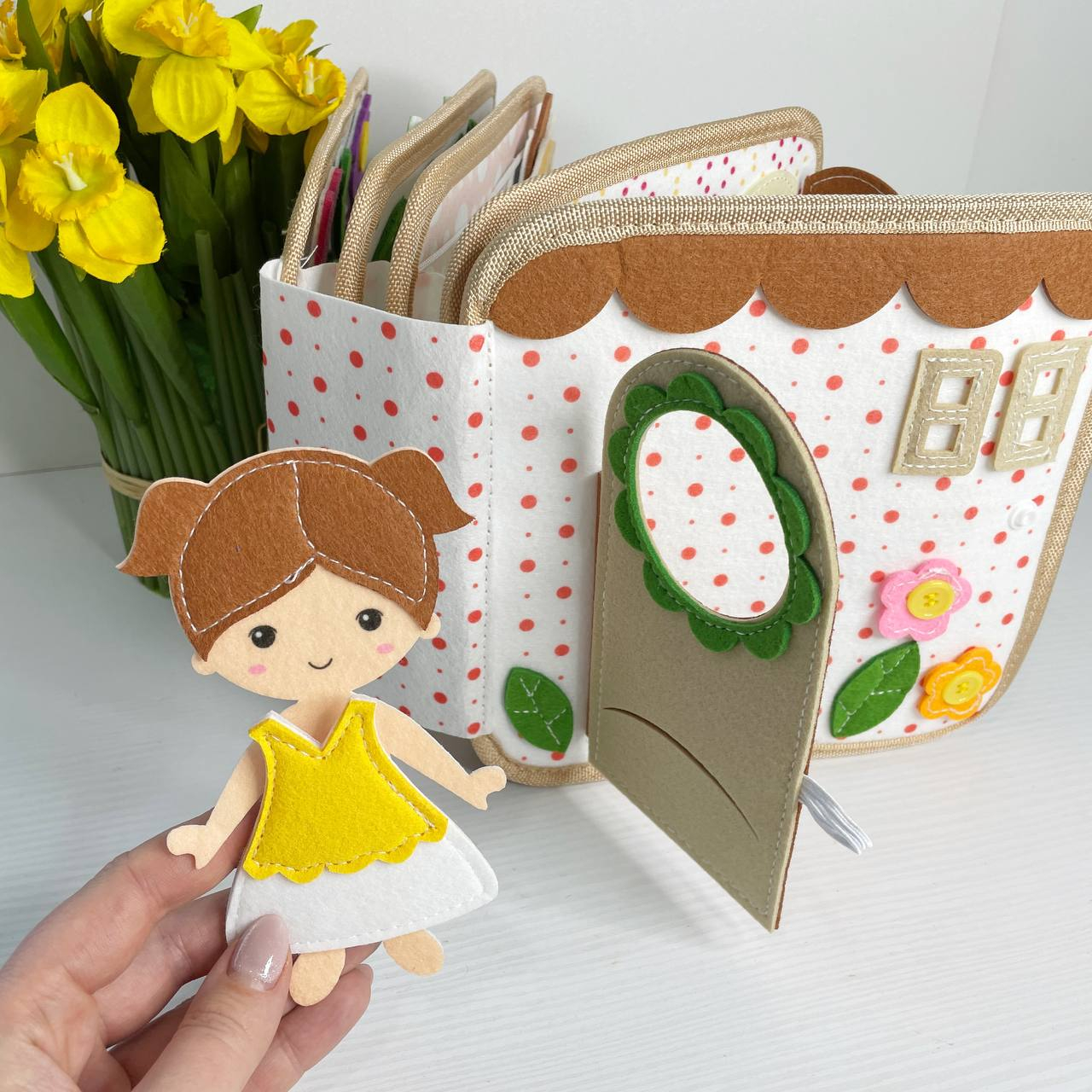 М'яка книжка-бізіборд 10 сторінок, фетрова лялечка, липучки, застібки, гардероб із одягом, ванна кімната,кухня, С 75319