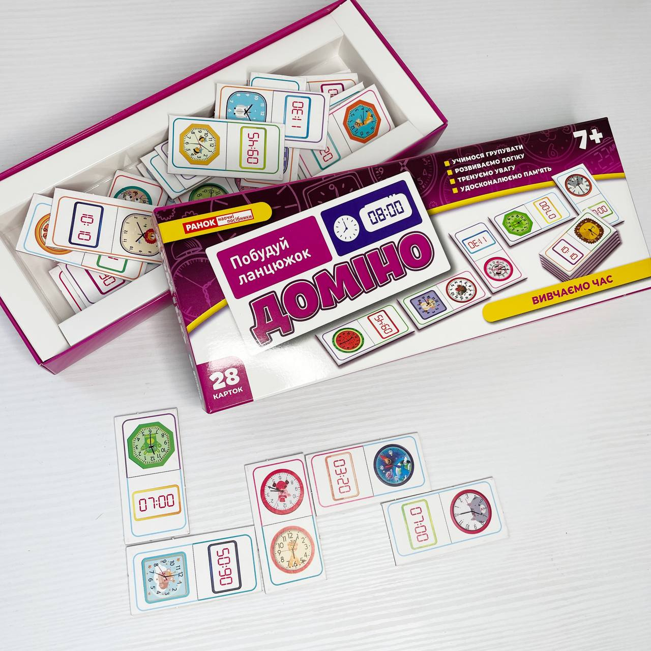 У наборі 28 фішок і прості правила (на упаковці). Грати можуть 2–4 учасники. Завдання — поєднувати фішки, на яких годинники показують однаковий час. Підказка: однаковий час позначено рамочками однакового кольору.