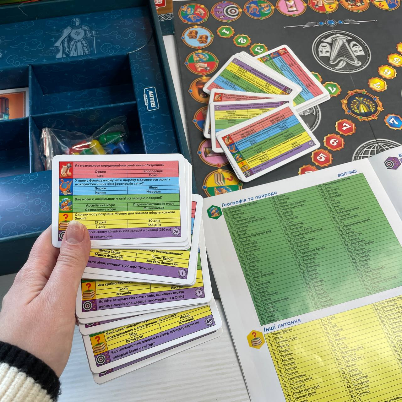 Artos Вікторина Всесвітня підійде для дружніх компаній, шкільних класів, сімейних вечорів чи просто для тренування памʼяті та логіки. Гру можна адаптувати під новачків завдяки полегшеному ігровому полю або ж перейти до складнішої версії для ерудованих учасників.